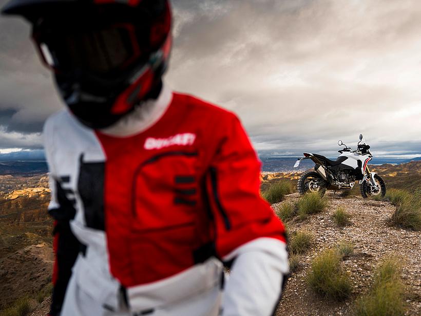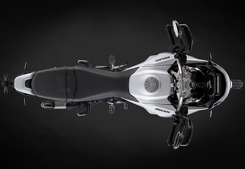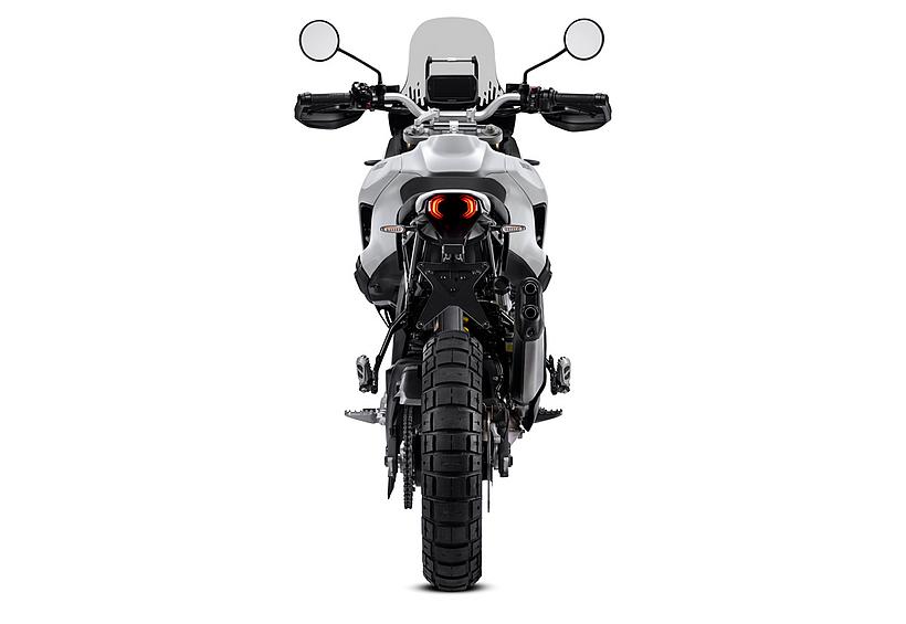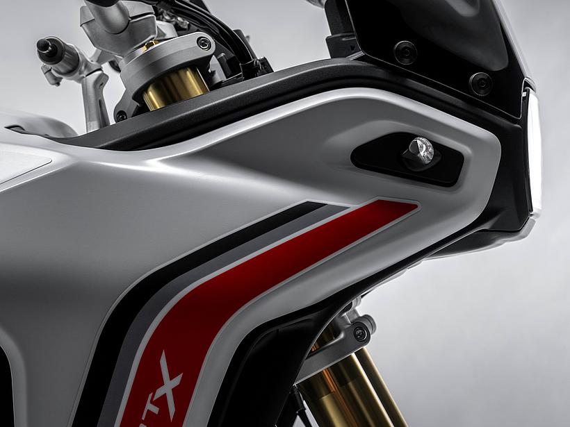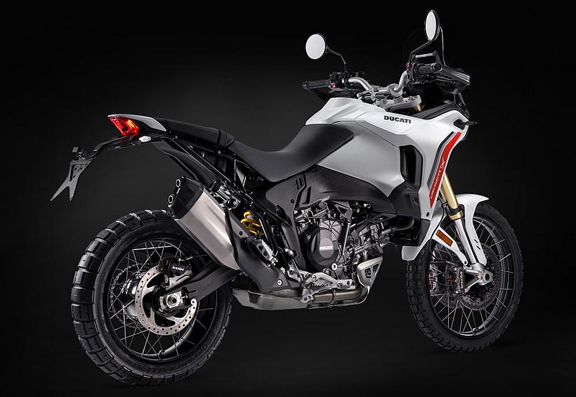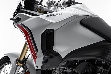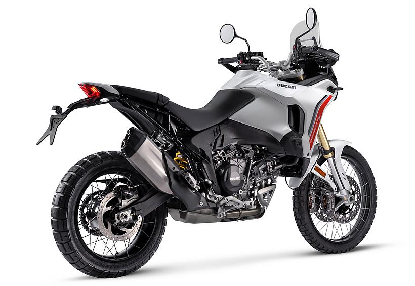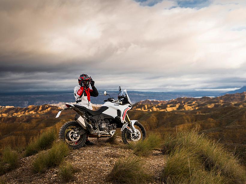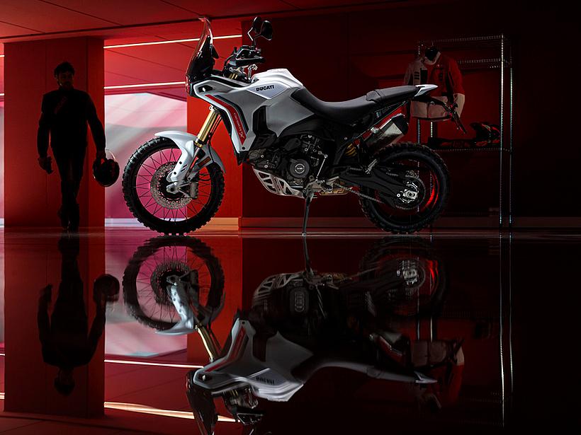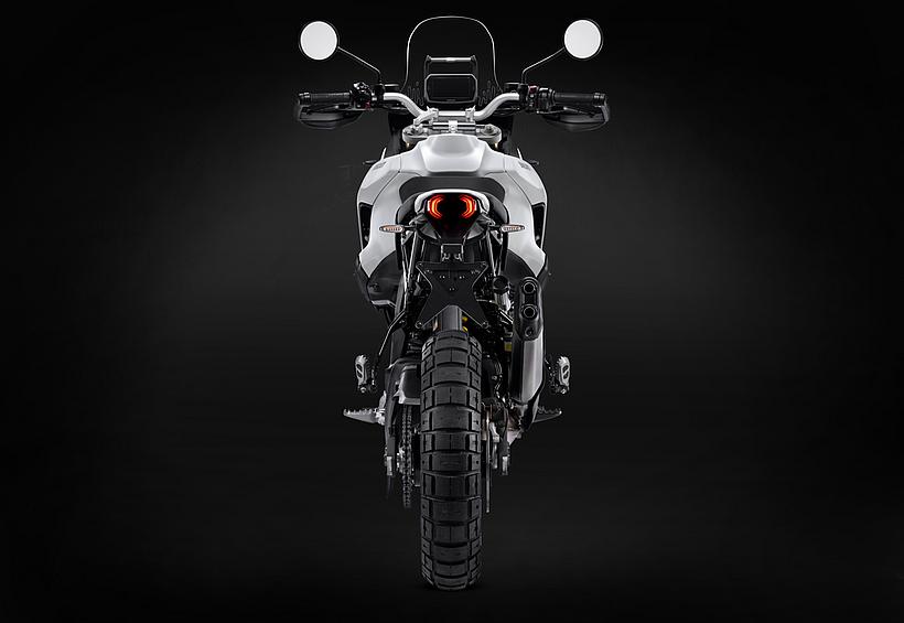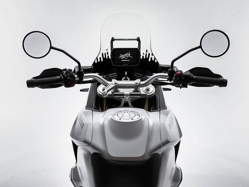 Dieses vielseitige Motorrad lässt sich nach Belieben mit dem umfangreiche Angebot an Ducati Performance Zubehör weiter individualisieren. Eine Rally-Sitzbank vereint Fahrer- und Soziussitz, während ein höherer vorderer Kotflügel, der problemlos als Alternative zum niedrigen montiert werden kann, die Offroad-Effizienz verbessert. Der hintere Zusatztank fasst 8 Liter zusätzliches Volumen und erhöht die Reichweite. Gleichzeitig dient er als erster Aufprallpunkt, um zentrale Komponenten im Falle eines Sturzes zu schützen. Kühlerabdeckungen und Sturzbügel steigern die Robustheit, während ein größeres Windschild und verstärkte Handprotektoren den Komfort und Schutz für den Fahrer erhöhen. Reisende profitieren von robusten Aluminiumkoffern mit speziellen Trägersystemen, die in Kombination mit dem Topcase bis zu 120 Liter Gepäckvolumen bieten. Offroad-Abenteurer können sich für ein Softbag-Set ohne Trägersystem entscheiden, das in Zusammenarbeit mit Mosko Moto entwickelt wurde. Im Bereich Elektronik stehen praktische Lösungen wie das Ducati Multimedia System (DMS) zur Bluetooth-Anbindung des Smartphones, eine Turn-by-Turn-Navigation und LED-Zusatzscheinwerfer zur Verfügung. Sportlich ambitionierte Fahrer werden den für den Straßenverkehr zugelassenen Endschalldämpfer mit Titanhülle und Carbon-Endkappen zu schätzen wissen, der in Zusammenarbeit mit Termignoni entwickelt wurde. Darüber hinaus sorgt die Racing-Auspuffanlage, ebenfalls von Termignoni, mit spezieller Abstimmung für eine Leistungssteigerung von 6 PS.
