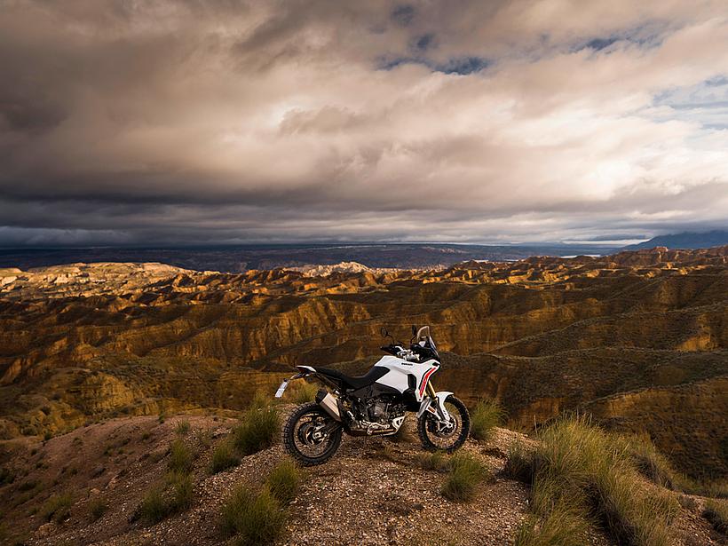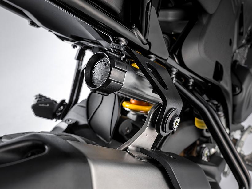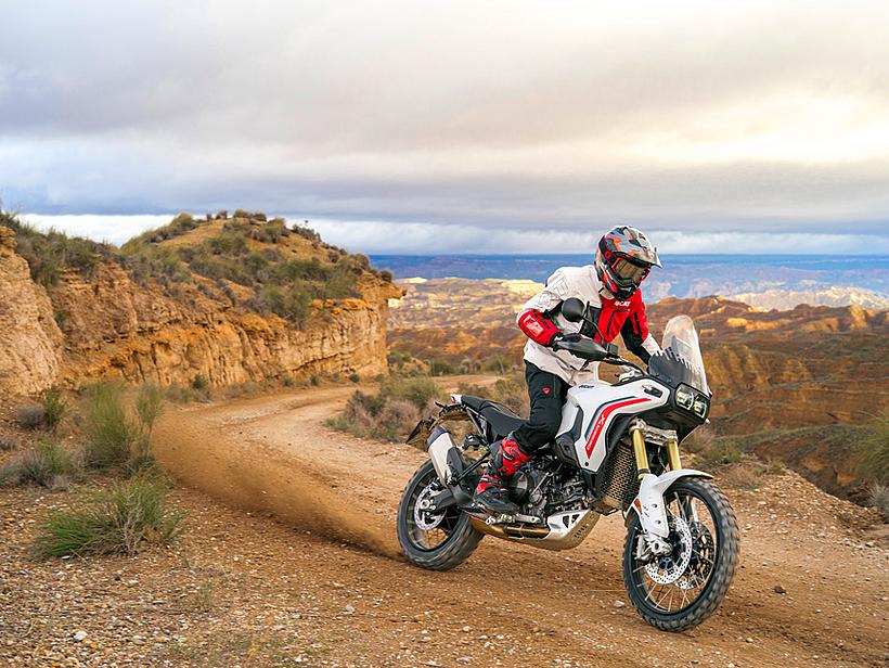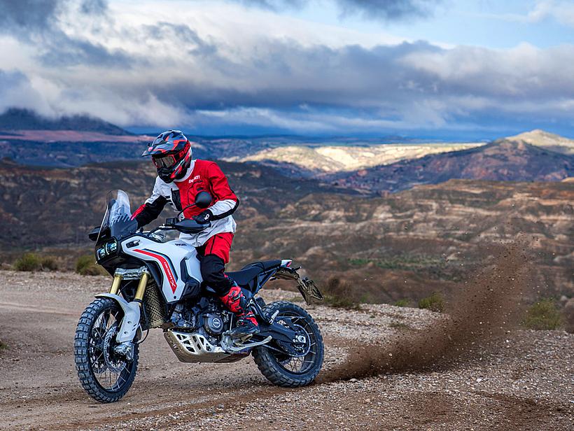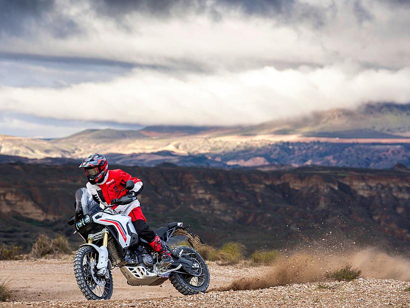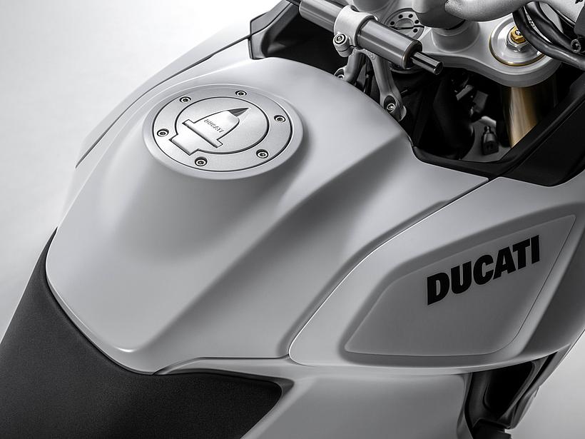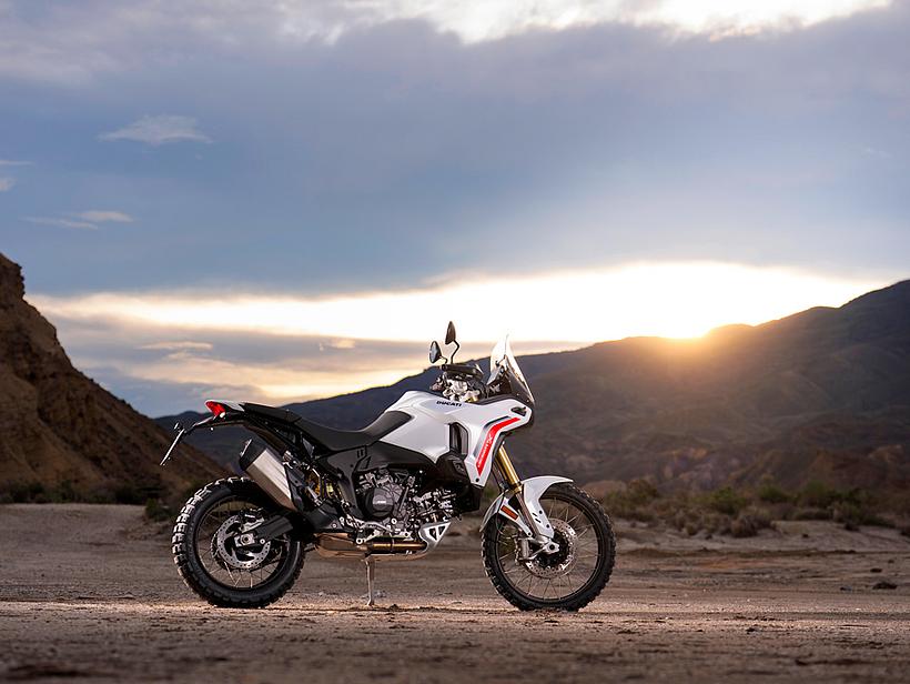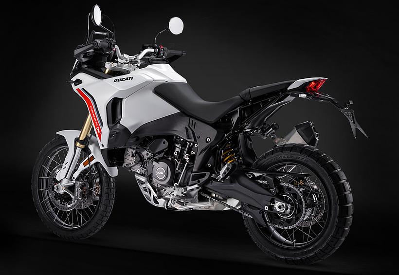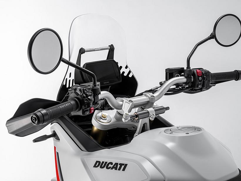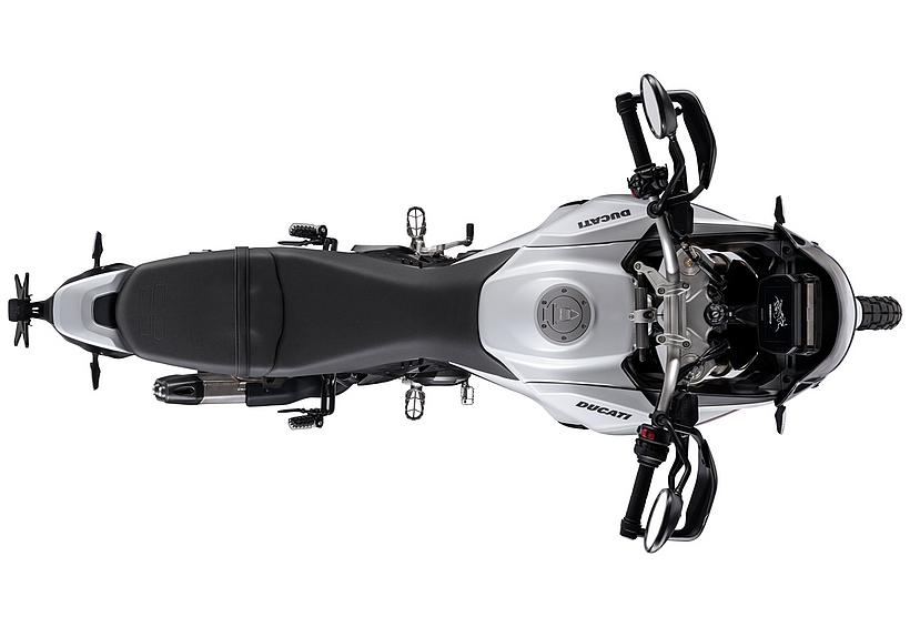 Dieses vielseitige Motorrad lässt sich nach Belieben mit dem umfangreiche Angebot an Ducati Performance Zubehör weiter individualisieren. Eine Rally-Sitzbank vereint Fahrer- und Soziussitz, während ein höherer vorderer Kotflügel, der problemlos als Alternative zum niedrigen montiert werden kann, die Offroad-Effizienz verbessert. Der hintere Zusatztank fasst 8 Liter zusätzliches Volumen und erhöht die Reichweite. Gleichzeitig dient er als erster Aufprallpunkt, um zentrale Komponenten im Falle eines Sturzes zu schützen. Kühlerabdeckungen und Sturzbügel steigern die Robustheit, während ein größeres Windschild und verstärkte Handprotektoren den Komfort und Schutz für den Fahrer erhöhen. Reisende profitieren von robusten Aluminiumkoffern mit speziellen Trägersystemen, die in Kombination mit dem Topcase bis zu 120 Liter Gepäckvolumen bieten. Offroad-Abenteurer können sich für ein Softbag-Set ohne Trägersystem entscheiden, das in Zusammenarbeit mit Mosko Moto entwickelt wurde. Im Bereich Elektronik stehen praktische Lösungen wie das Ducati Multimedia System (DMS) zur Bluetooth-Anbindung des Smartphones, eine Turn-by-Turn-Navigation und LED-Zusatzscheinwerfer zur Verfügung. Sportlich ambitionierte Fahrer werden den für den Straßenverkehr zugelassenen Endschalldämpfer mit Titanhülle und Carbon-Endkappen zu schätzen wissen, der in Zusammenarbeit mit Termignoni entwickelt wurde. Darüber hinaus sorgt die Racing-Auspuffanlage, ebenfalls von Termignoni, mit spezieller Abstimmung für eine Leistungssteigerung von 6 PS.