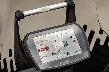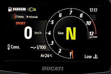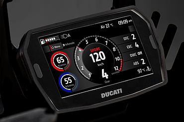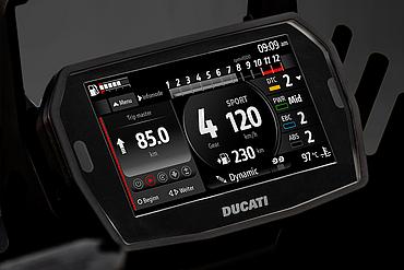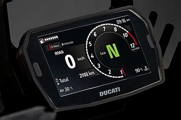 Die Funktionen des Elektronikpakets der neuesten Generation werden auf einem horizontal angeordneten 5"-TFT-Dashboard im Format 16:9 angezeigt und über einen „Petal“-Joystick gesteuert. Zur Betonung der Klarheit und Eleganz des neuen Dashboards wurden die Warnleuchten – mit Ausnahme der roten LED des Drehzahlbegrenzers – von der Außenmaske entfernt und ins Innere des Displays verlegt. Drehzahlmesser und Ganganzeige blinken pulsierend: Grün signalisiert den idealen Schaltzeitpunkt, Rot den Eingriff des Drehzahlbegrenzers. Während der Einfahrphase färbt sich der Drehzahlmesser Orange, wenn die empfohlene Drehzahl überschritten wird. Das Dashboard bietet drei Info-Modi – Road, Road Pro und Rally – jeweils mit automatischer Umschaltung zwischen Tag- und Nachtbeleuchtung. Sie unterscheiden sich in der Art der angezeigten Informationen und der grafischen Darstellung. Mit dem Joystick am Lenker kann während der Fahrt direkt zwischen den Modi gewechselt werden. So passt Road Pro beispielsweise die Anzeige in Echtzeit an den prozentual genutzten Leistungs- und Drehmomentanteil an. Darüber hinaus ermöglicht das Dashboard die Bluetooth-Kopplung mit einem Smartphone und einem Helm-Kommunikationssystem, um Musik abzuspielen, Anrufe entgegenzunehmen und Turn-by-Turn-Navigationsanweisungen zu empfangen, sofern das Navigationssystem installiert ist.