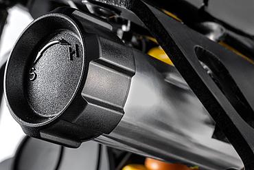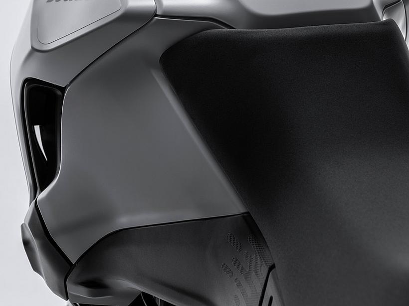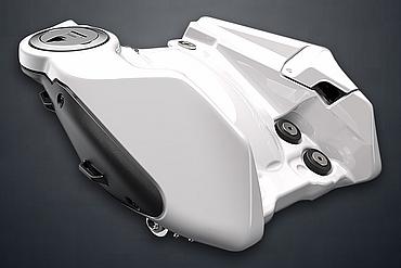 Der neue, schlankere 18-Liter-Kunststofftank gewährleistet eine ausreichende Reichweite. Durch seine tiefere Positionierung im Motorrad wird zudem der Schwerpunkt gesenkt und eine freiere Bewegungsfreiheit im Sattel ermöglicht. Integrierte, aluminiumverstärkte seitliche Crashpads – als erster Kontaktpunkt bei einem Umfaller – schützen den Tank. Sie sind austauschbar, wodurch Reparaturen nach einem Sturz einfacher und kostengünstiger durchgeführt werden können.