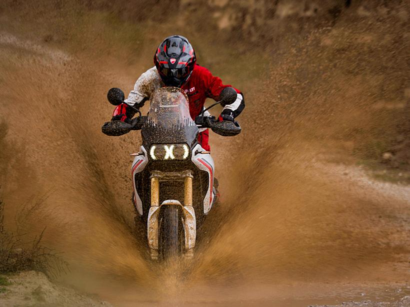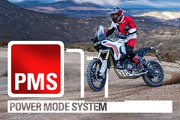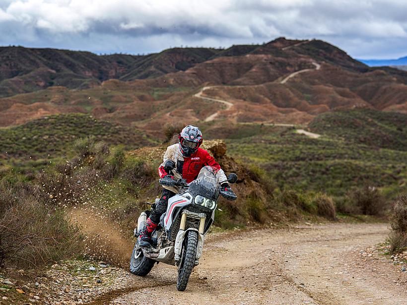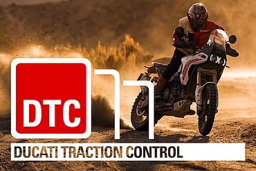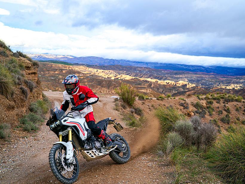 Der Riding Mode Enduro unterstützt auch weniger erfahrene Fahrer beim Fahren im Gelände. Im Power Mode Medium ist die maximale Motorleistung auf 75 PS begrenzt, während die Gasannahme direkt bleibt, um schnell auf Hindernisse reagieren zu können. In diesem Riding Mode ist das ABS-System auf Stufe 2 eingestellt, kann jedoch über die entsprechende Taste vollständig deaktiviert werden. Die Ducati Traction Control (DTC) ist auf Stufe 3 gesetzt, die Ducati Wheelie Control (DWC) ist deaktiviert, und das Motorbremsmanagement wird ebenfalls auf Stufe 3 reduziert.