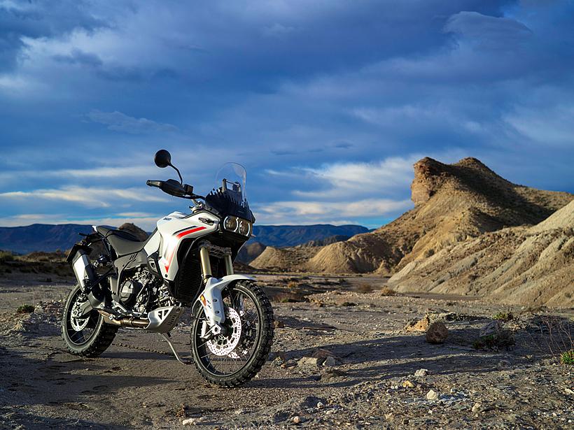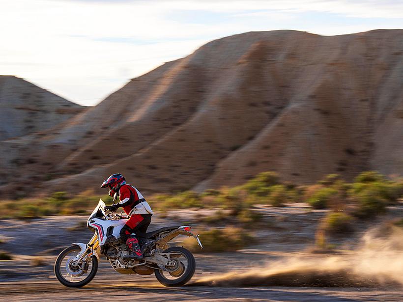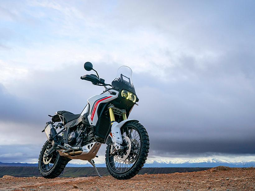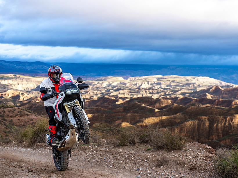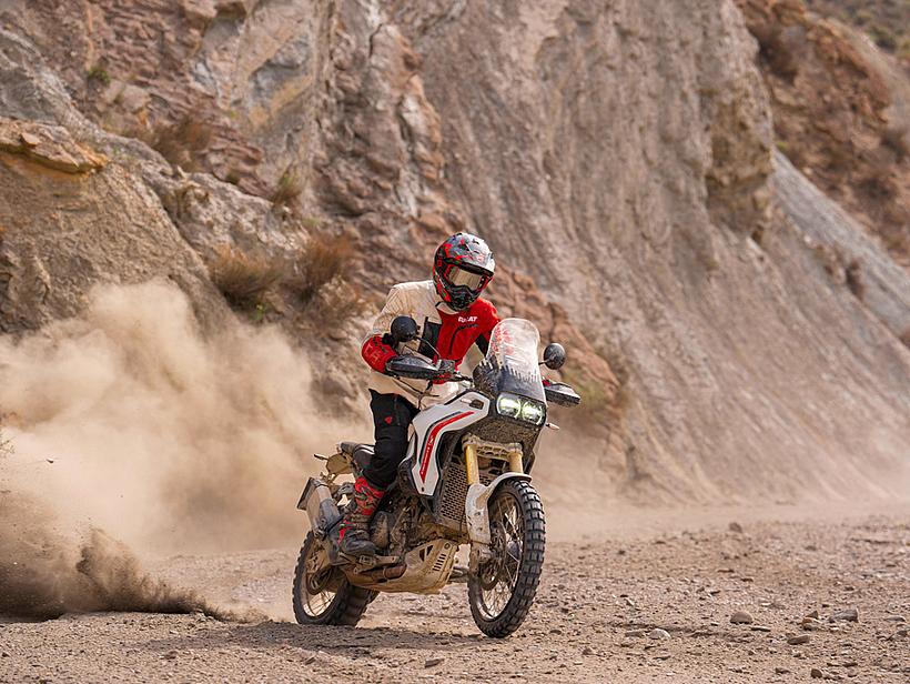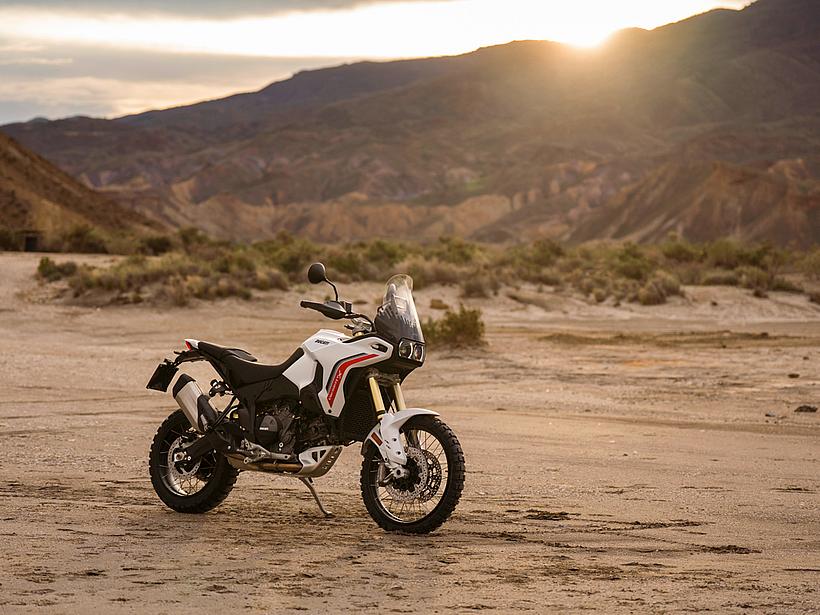 Die Getriebeübersetzungen wurden speziell für die DesertX optimiert: Der erste und zweite Gang sind kürzer übersetzt, um eine bessere Kontrolle bei niedrigen Geschwindigkeiten und kräftige Beschleunigung unter Last zu ermöglichen. Die fünfte und sechste Gänge wurden verlängert (24/27 und 26/25 statt 21/24 und 25/26), ebenso wie die insgesamt kürzere Sekundärübersetzung (15/46 statt 15/40). Dadurch sind die ersten vier Gänge kürzer übersetzt und bieten eine bessere Offroad-Tauglichkeit, während die letzten beiden Gänge länger übersetzt sind, was niedrigere Drehzahlen auf Landstraße und Autobahn ermöglicht – für spürbar höheren Komfort und geringeren Verbrauch.