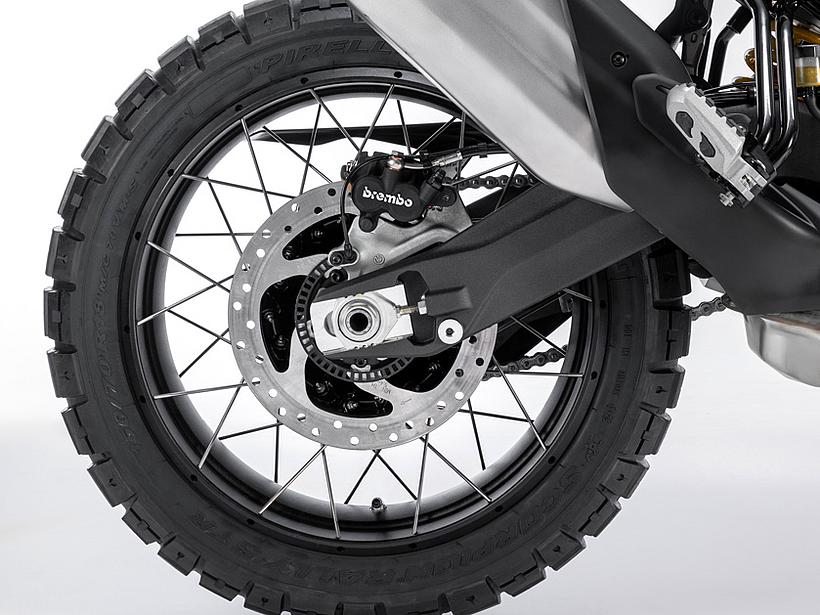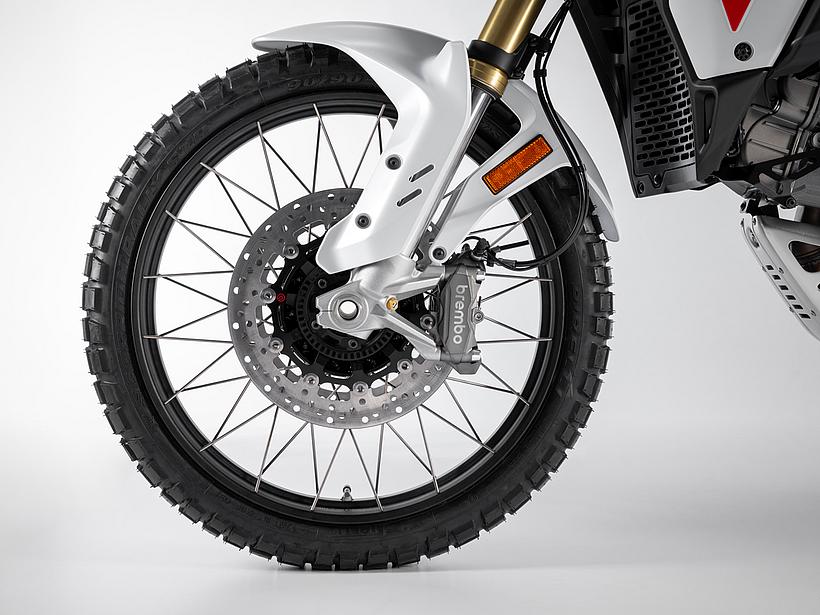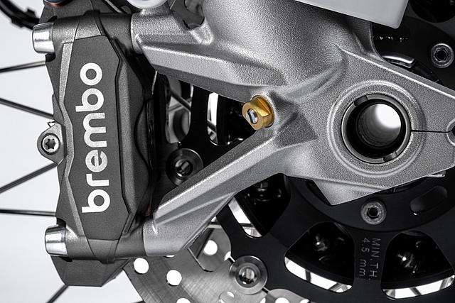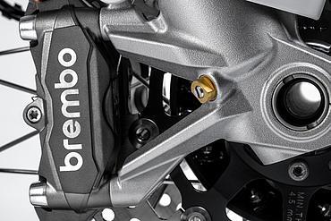 Das Brembo-Bremssystem gewährleistet herausragende Bremsleistung mit höchster Präzision und optimalem Ansprechverhalten. Es bietet eine exzellente Linearität zwischen der aufgebrachten Bremskraft und der Bremsperformance. An der Vorderachse kommen Brembo M4 32 Monoblock-Bremssättel mit je vier 32-mm-Kolben zum Einsatz, die auf zwei 305-mm-Bremsscheiben wirken. Die Monoblock-Bauweise der Bremssättel, die aus einem Stück gefertigt sind, sorgt für maximale Steifigkeit und Formstabilität, was die hohe Bremspräzision und -performance garantiert. Dank einer optimierten Anordnung der Leitungsverbindungen zwischen Hauptbremszylinder und Bremssätteln ist nun kein spezielles Kit mehr erforderlich, um einen hohen vorderen Kotflügel zu montieren – dieser kann direkt an der unteren Gabelbrücke befestigt werden. Das vordere Bremssystem wird von einer Brembo Radialpumpe mit einstellbaren Hebeln gesteuert, die ein exzellentes Gefühl vermittelt und eine Bremsleistung bietet, die in diesem Segment Maßstäbe setzt. Hinten sorgt eine 265-mm-Bremsscheibe in Kombination mit einem Brembo 2-Kolben-Bremssattel für effektive Verzögerung. Der hintere Bremshebel verfügt über ein anderes Übersetzungsverhältnis als beim Vorgängermodell, um die Dosierbarkeit zu verbessern. Zudem lässt sich die Hebelhöhe einfach anpassen, was schnelle Wechsel zwischen Straßen- und Offroad-Einsatz erleichtert.