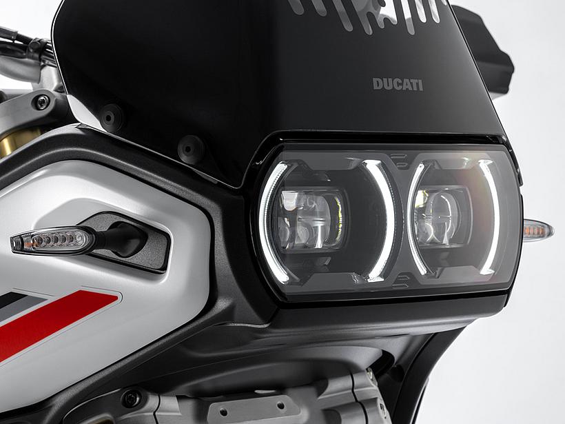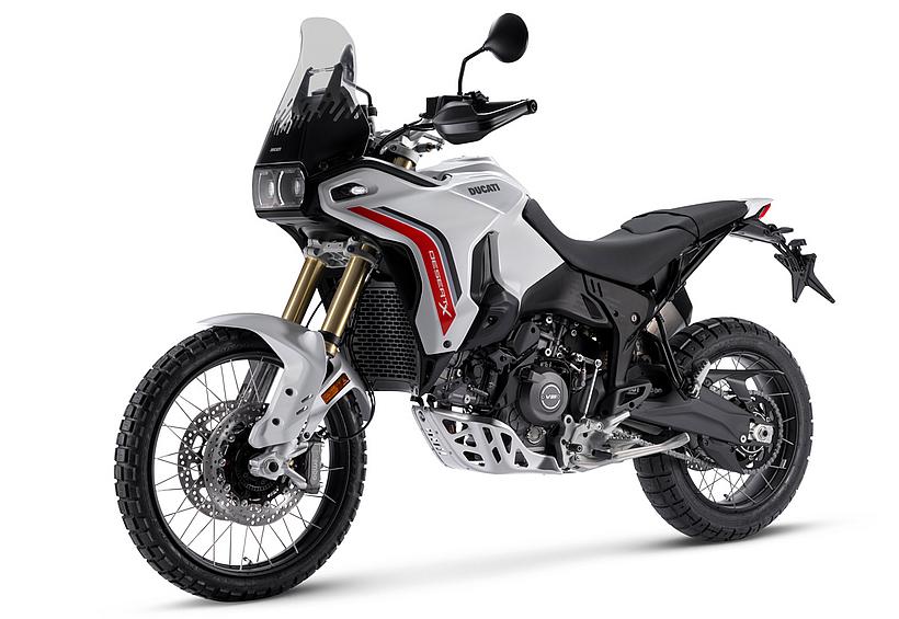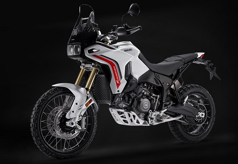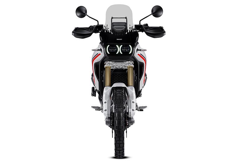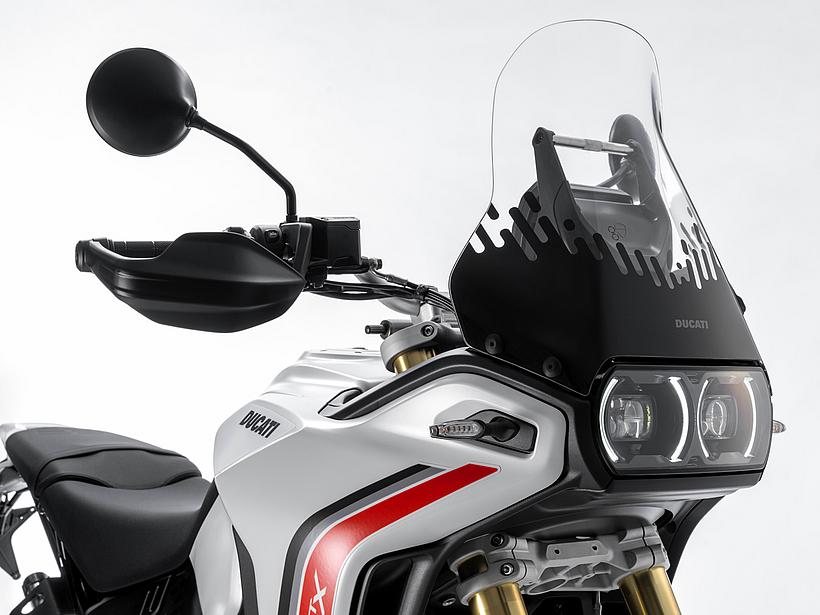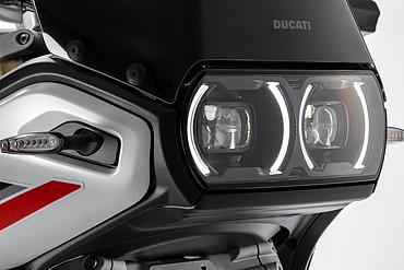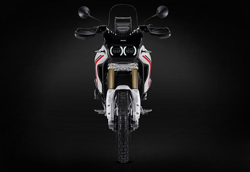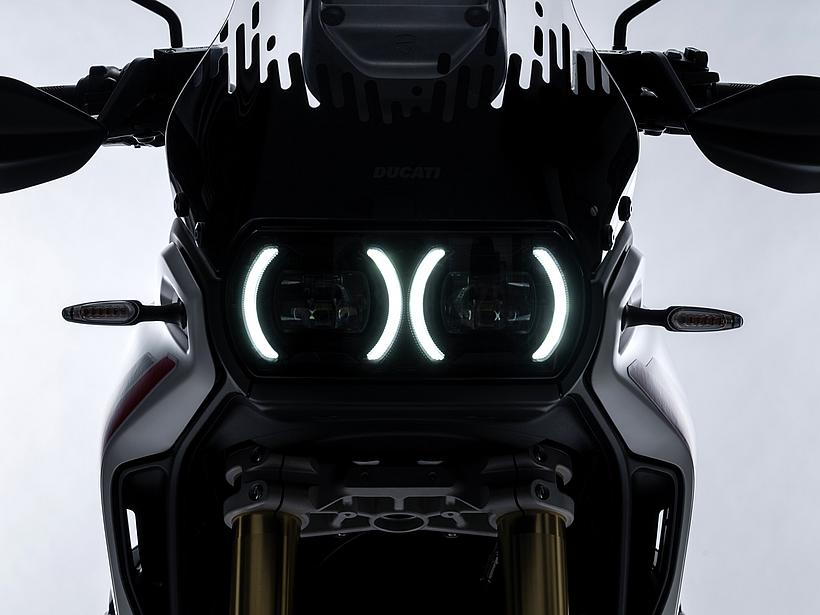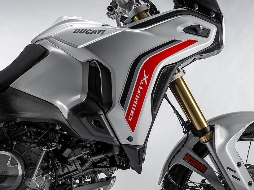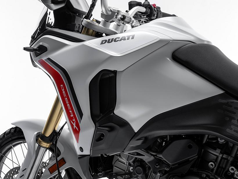 Die DesertX wurde komplett neu gestaltet, wobei die moderne technische Konfiguration im Design deutlich zum Ausdruck kommt. Sie löst sich von der klassischen Inspiration der Dakar-Legenden und entwickelt sich zu einer zeitgemäßen, funktionalen und eigenständigen Linie. Gleichzeitig bleibt sie durch ikonische Designelemente, wie die Lichtsignatur der Front- und Heckscheinwerfer sowie das nun horizontal angeordnete Tagfahrlicht (DRL), klar als DesertX erkennbar. Das Centro Stile Ducati arbeitete eng mit der Forschungs- und Entwicklungsabteilung zusammen, um sicherzustellen, dass das Design die geringere Masse und höhere Agilität der neuen DesertX widerspiegelt – ganz nach dem Prinzip "Form folgt Funktion". Besonders die Front wurde abgesenkt, um dem Fahrer eine dominantere Sitzposition zu bieten, sodass er das Gefühl hat, "über" dem Motorrad zu sitzen statt in ihm. Der vordere Kotflügel bietet mehr Freiraum über dem Rad, wodurch das Risiko verringert wird, dass sich im schweren Gelände Schlamm ansammelt und das Rad blockiert. Zudem ermöglicht die neue Bremsanlage die Montage eines hohen Kotflügels ohne Modifikationen. Besondere Aufmerksamkeit galt der Optimierung der Kontaktflächen, um Fahrer und Körperbewegungen im Gelände besser zu unterstützen. Vor allem die Seitenteile wurden mit einer strukturierten Oberfläche versehen, die den Grip im Kniebereich verbessert. Öffnungen im vorderen Verkleidungsbereich sorgen für eine bessere Kühlung. Auch der Motorschutz verfügt über zahlreiche Belüftungsöffnungen, die nicht nur das optische Gewicht reduzieren, sondern auch verhindern, dass sich Wasser und Schlamm im Offroad-Einsatz ansammeln.