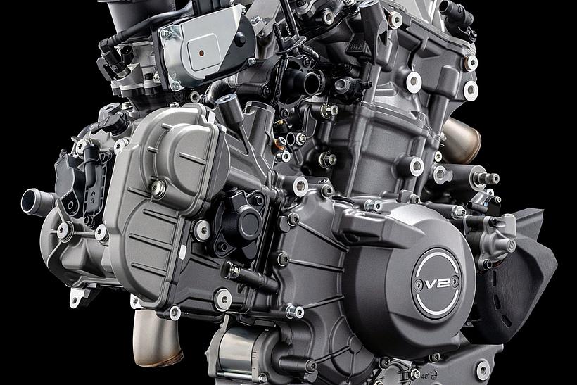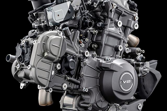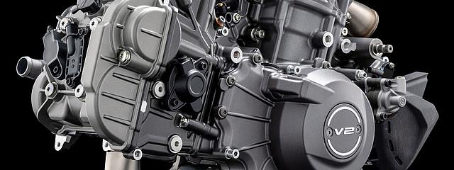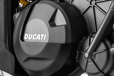 Das 90°-V2-Layout ermöglicht den Bau eines schlanken, charakterstarken Motors mit exzellentem Sound und kraftvoller Leistungsentfaltung – ganz in bester Ducati-Tradition. Der 90°-Zylinderwinkel sorgt zudem für einen natürlichen Massenausgleich der Kräfte erster Ordnung, weshalb keine Ausgleichswelle zur Reduzierung von Vibrationen notwendig ist. Um die Gewichtsverteilung weiter zu optimieren, wurden die Zylinder um 20° nach hinten geneigt, ausgehend vom horizontalen Zylinder. Dieser Motor garantiert exzellentes Handling und sorgt so für maximalen Fahrspaß.