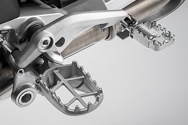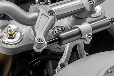 Der serienmäßige Ölwannenschutz aus Aluminium deckt den größten Teil des Motors ab und fügt sich perfekt in die Linie des Motorrads ein. Für härteren Offroad Einsatz kann die DesertX auch mit einem verstärkten Motorschutz, der direkt mit dem Rahmen verbunden ist, aufgerüstet werden. So wird bei einer unsanften Berührung - die Offroad nicht immer vermieden werden kann - die Kraft in den stabilen Stahrrohrrahmen abgeleitet und der Motor wird bestmöglich geschützt.