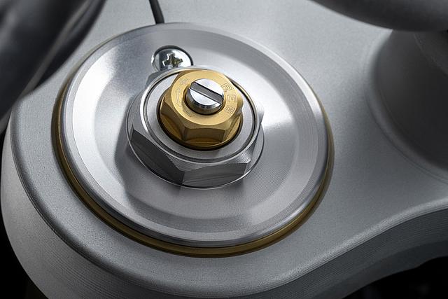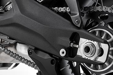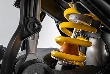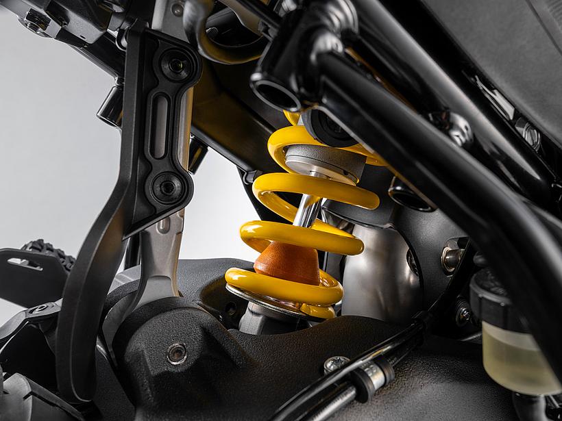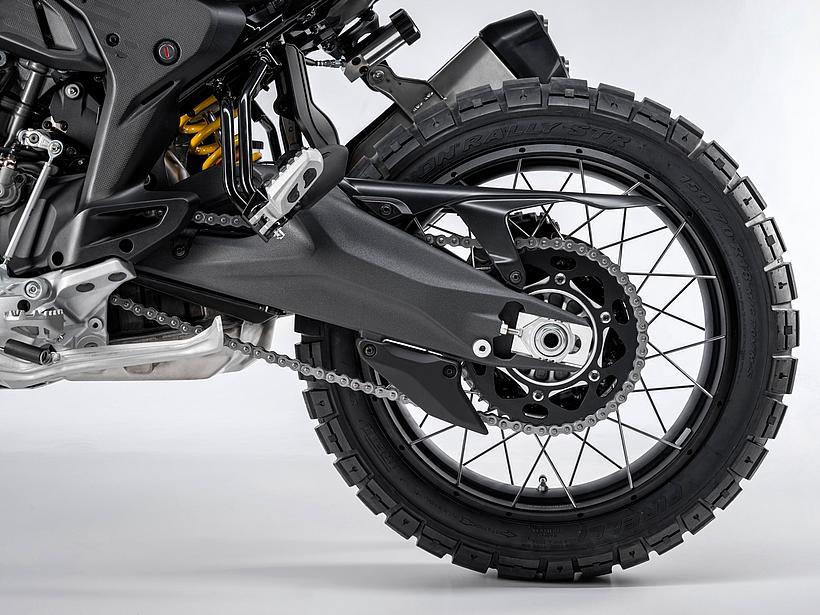 Die speziell entwickelte Zweiarmschwinge aus Aluminium-Druckguss ist robuster und direkt am Motor befestigt. Im Vergleich zur Multistrada V2 wurde der Schwingenlagerpunkt um 6 mm abgesenkt. Die Hinterradmutter ist jetzt mit einem Standard-Sechskant versehen, was Wartung und Radwechsel – auch im Gelände oder bei Adventure-Events – deutlich vereinfacht. Die neue progressive Umlenkung der DesertX sorgt für ein sanftes Ansprechen zu Beginn des Federwegs und bietet mehr Unterstützung im weiteren Verlauf. Dies verbessert den Komfort, die Kontrolle und den Durchschlagschutz, sodass die DesertX auch in anspruchsvollem Gelände eine noch bessere Performance bietet.