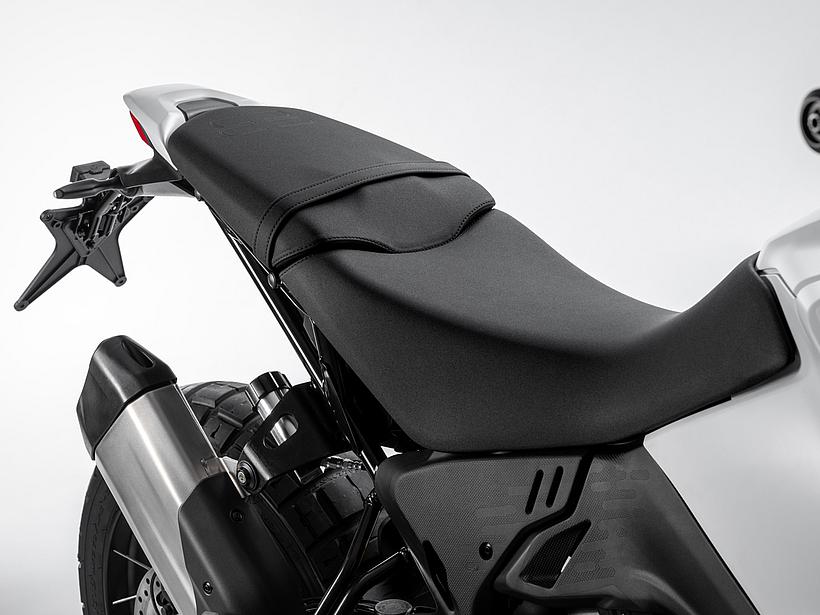 Um die Sitzhöhe und den Sitztyp an die Bedürfnisse des Fahrers anzupassen und auch beim Manövrieren im Stand jederzeit sicheren Halt zu gewährleisten, bietet die DesertX mehrere Sitzbänke als Original-Zubehör an. Die Standard-Sitzhöhe kann von 880 mm auf 860 mm reduziert werden, und durch die Verwendung eines Tieferlegungskits lässt sich die Höhe um weitere 20 mm auf 840 mm verringern. Zusätzlich ist eine um 20 mm höhere Sitzbank erhältlich. Für den Offroad-Einsatz gibt es zudem eine einteilige Rally-Sitzbank mit spezieller Formgebung, die für optimale Kontrolle im Gelände sorgt.