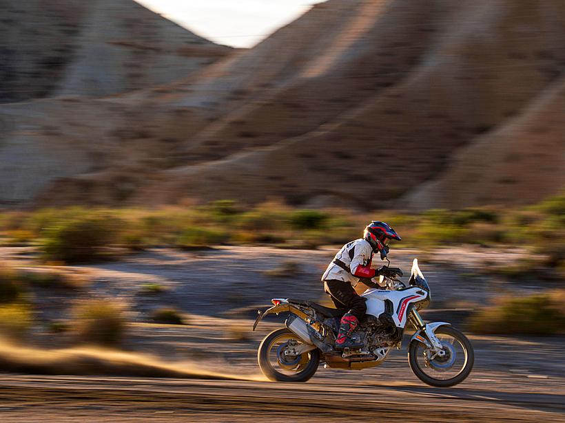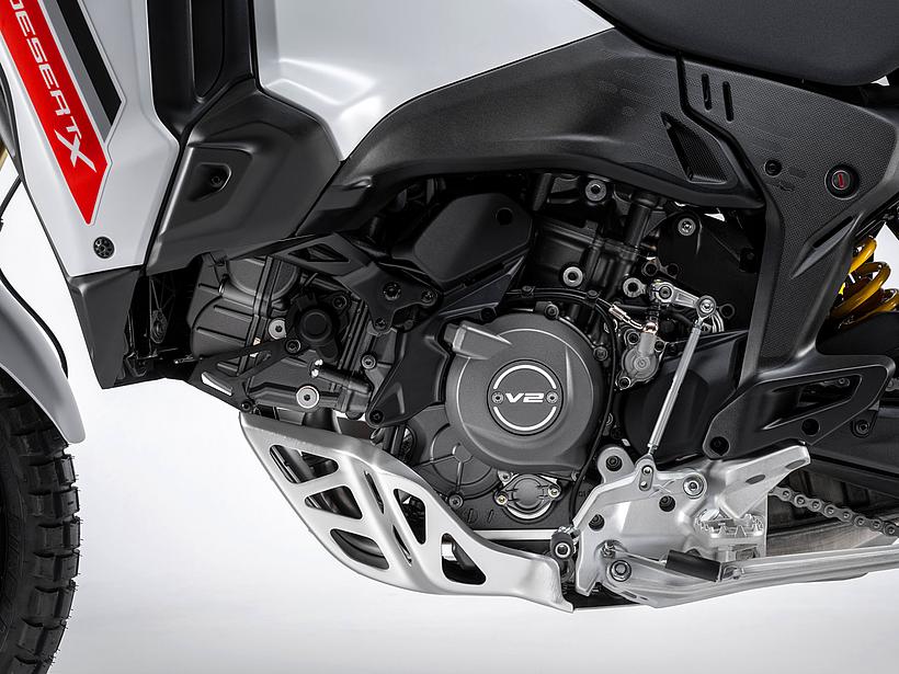 Das Fahrwerk der neuen DesertX wurde vollständig neu entwickelt, um im Gelände ein neutrales, einfaches und intuitives Fahrverhalten zu bieten, während gleichzeitig die hervorragenden Straßeneigenschaften erhalten bleiben. Das Chassis nutzt eine speziell entwickelte Monocoque-Struktur, die sowohl als Rahmen als auch als Airbox dient und den V2-Motor als tragendes Element integriert. Diese kompakte Lösung ermöglicht ein fahrfertiges Gewicht von nur 209 kg ohne Kraftstoff. Der Radstand von 1.615 mm und der Lenkkopfwinkel von 27,4° mit einem Nachlauf von 113,8 mm sorgen für Stabilität bei hohen Geschwindigkeiten auf der Straße, ohne die Wendigkeit im Gelände zu beeinträchtigen. Die Monocoque-Struktur besteht aus Aluminiumguss und nutzt den neuen V-Twin-Motor als tragendes Element, der direkt am vertikalen Zylinderkopf befestigt ist. Der Heckrahmen bleibt eine Stahl-Gitterrohr-Konstruktion, die oben mit dem Monocoque und unten direkt mit dem Motor verbunden ist. Ein abnehmbarer Abschnitt erleichtert den Zugang zum hinteren Zylinder bei der Ventilspielkontrolle, was den Wartungsaufwand verringert und somit die Betriebskosten senkt.