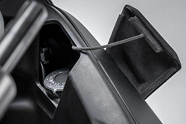 Das horizontal angeordnete Cockpit mit serienmäßiger Utility-Bar s c h a f f t P l a t z i m o b e r e n V e r k l e i d u n g s b e r e i c h f ür N a v i g a t i o n s g e r ät e u n d v e r b e s s e r t d i e S i c h t a u f d e n B e r e i c h d i r e k t v o r d e m M o t o r r a d – h i l f r e i c h auch b e i m s t e h e n d e n F a h r e n i m G e län d e .