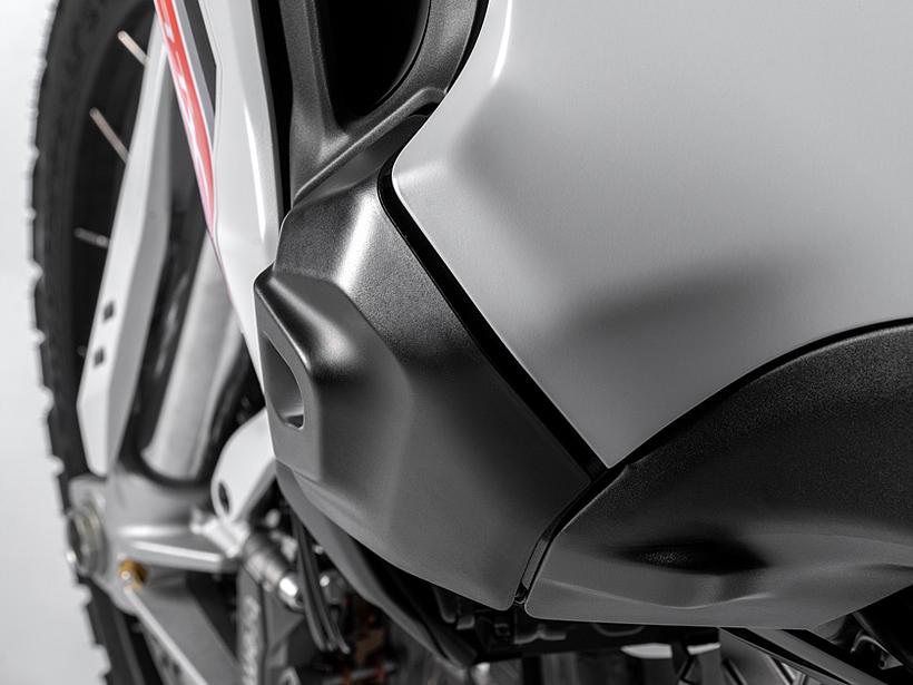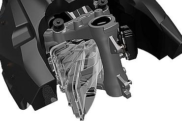 Neben der Funktion als Rahmen dient sie gleichzeitig als 12,5-Liter-Airbox, die oben durch den Tank abgeschlossen wird. In ihr befinden sich der Luftfilter, die Drosselklappen und das Kraftstoffsystem inklusive der Einspritzdüsen. Der Luftfilter ist besonders wartungsfreundlich: Nach vollständigem Einschlagen der Lenkung müssen nur drei Schrauben gelöst werden, um Ansaugstutzen und Filter zu entfernen – ideal für eine schnelle Reinigung nach Offroad-Einsätzen.