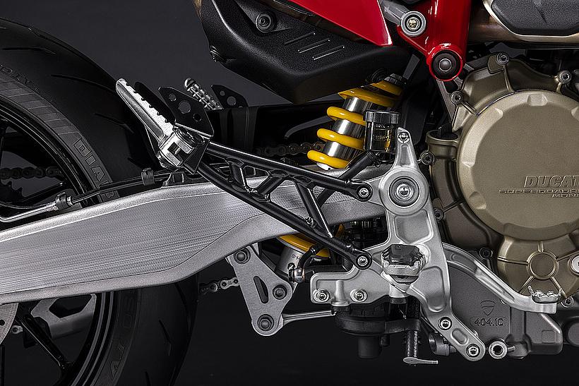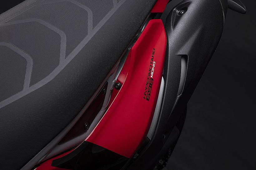 Die Zweiarm-Schwinge der Hypermotard 698 Mono, die eine Länge von 572 mm aufweist, wird aus einem einzigen Stück Aluminiumguss gefertigt. Ihre minimalistische Gestaltung und partiell bearbeitete Oberfläche verleihen ihr eine markante Ästhetik. Trotz ihres geringen Gewichts von nur 3,9 kg bietet sie eine bemerkenswerte Steifigkeit.