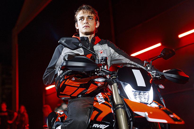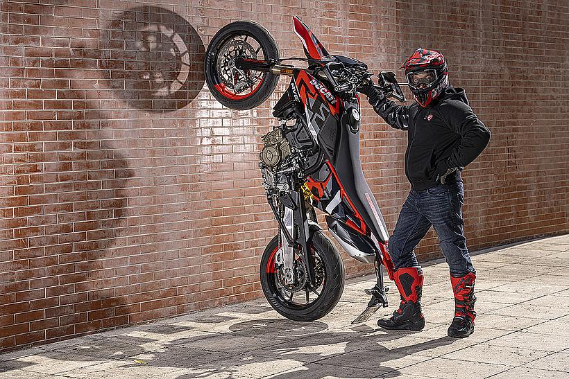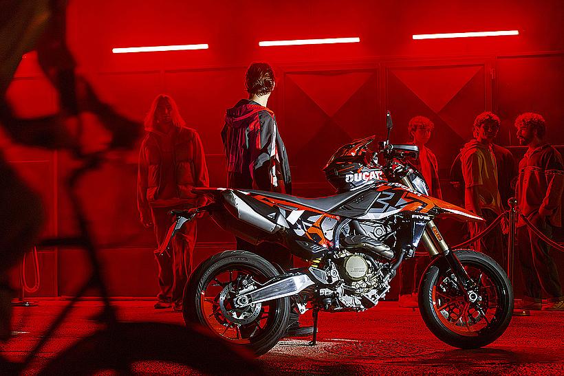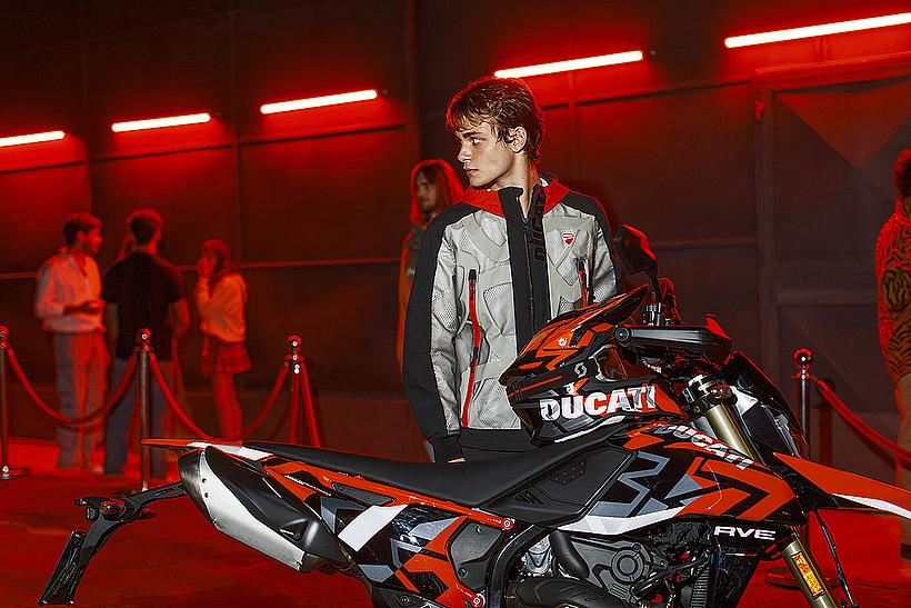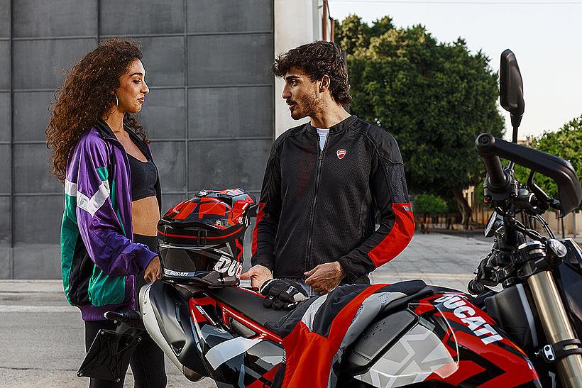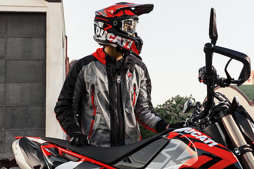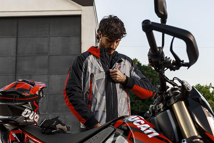 Die Hypermotard 698 Mono ist ein Motorrad, das leicht zu fahren, spaßig und stilvoll ist und gemeinsam mit einer eigenen Bekleidungslinie auf den Markt kommt. Die Jacke „Overlay Yo“ ist das Herzstück der Kollektion. Sie zeichnet sich durch ihr modernes und originelles Design aus, das in Zusammenarbeit mit Drudi Performance entwickelt wurde, kombiniert ein transparentes Außenmaterial mit einem thermoregulierenden 3D-Mesh. Die äußerst vielseitige Jacke, hergestellt von Spidi Sport, kann sogar mit einer Airbag-Schutzweste kombiniert werden. Die Kollektion wird durch ein Sweatshirt ergänzt, das dank technischer Gewebeverstärkungen und CE-Protektoren an Schultern und Ellbogen auch für den Einsatz auf Motorrädern zertifiziert ist. Als perfekte Ergänzung steht ein spezieller Helm im aggressiven Supermotard-Look zur Verfügung, ebenso wie Stiefel, die speziell für den Motard-Einsatz entwickelt wurden, und Sportschuhe für den täglichen Gebrauch auf dem Motorrad.