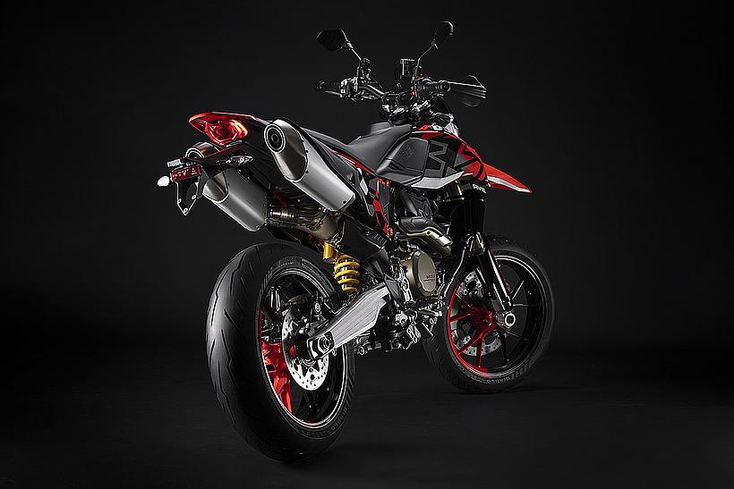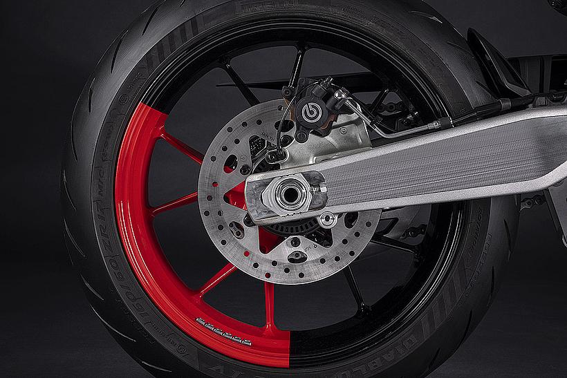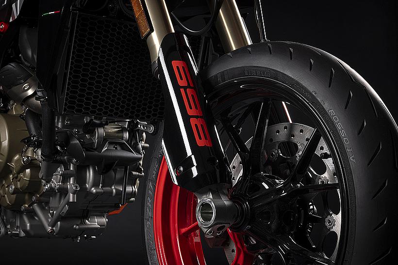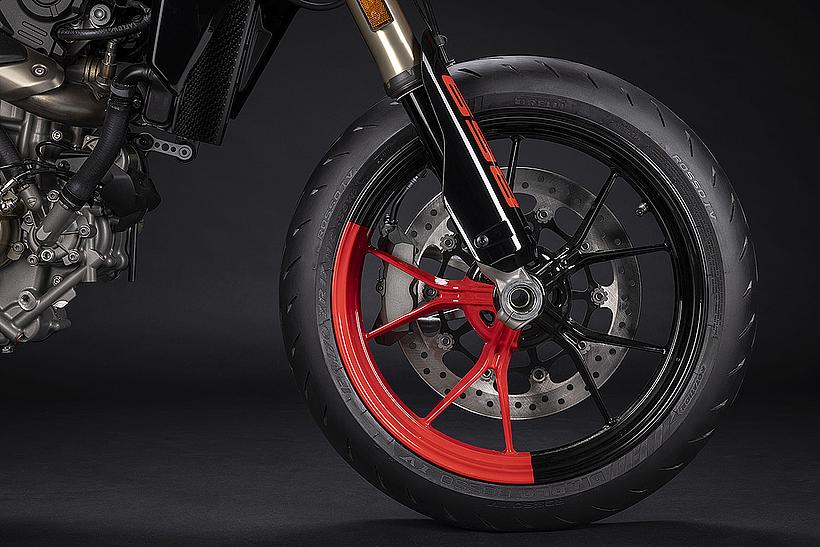 Um die ungefederten und rotierenden Massen zu verringern, setzt die Hypermotard 698 Mono auf noch leichtere Fünfspeichen-Gussräder im Y-Design. Diese Räder sind etwa 500 Gramm leichter als vergleichbare Speichenfelgen. Zudem sind Aluminium-Bremsscheibenflansche verbaut, die um 17% leichter sind als ihre Stahl-Pendants. Dies führte zu einer erheblichen Reduzierung der Massenträgheit und ermöglicht ein hervorragendes Handling mit höchster Präzision. Die Reifen der Wahl sind die bewährten Pirelli Diablo Rosso IV in den Größen 120/70 ZR 17 vorne und 160/60 hinten.