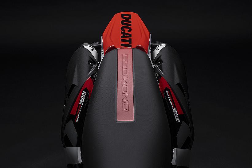 Die Hypermotard 698 Mono kombiniert die charakteristische Ästhetik des Supermotard-Rennsports - essenziell, kompakt und aggressiv - mit den klaren Linien, die für das Ducati-Design typisch sind. Das Ergebnis ist ein schlankes und schnittiges Motorrad. Die minimalistischen Verkleidungen vermitteln sofort die Sportlichkeit von Ducati und setzen den Superquadro Mono Motor perfekt in Szene. Die hohe und flache Sitzbank, der hohe vordere Kotflügel, das markante Heck und die Startnummernfelder sind allesamt Elemente, die dieses Statement unterstreichen.