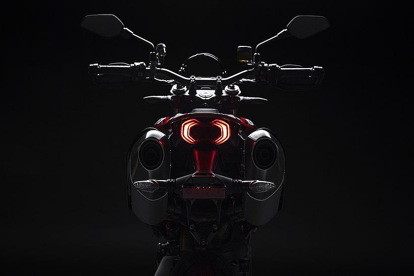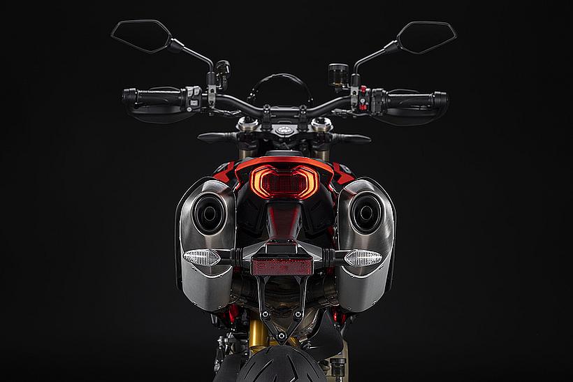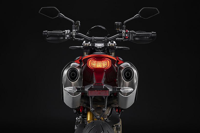 Der äußerst kompakte Full-LED-Scheinwerfer beinhaltet die DRL-Funktion, konkret das Tagfahrlicht in Form eines doppelten "C"-Lichtprofils, und verleiht der Hypermotard 698 Mono eine auffällige Präsenz auf der Straße, sodass sie nicht unbemerkt bleibt. Diese charakteristische Lichtsignatur spiegelt sich auch im Rücklicht wider. Auch bei den Blinker kommt vorne wie hinten LED-Technologie zum Einsatz.