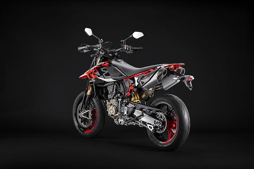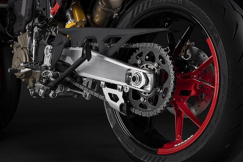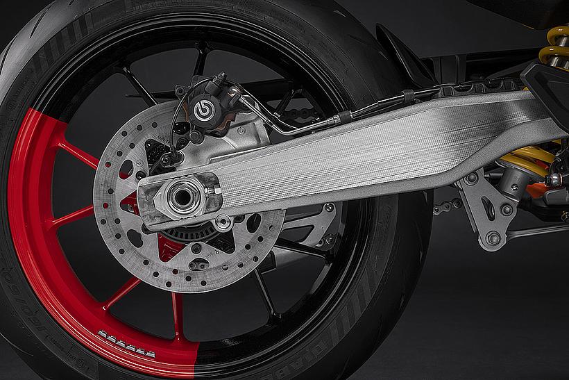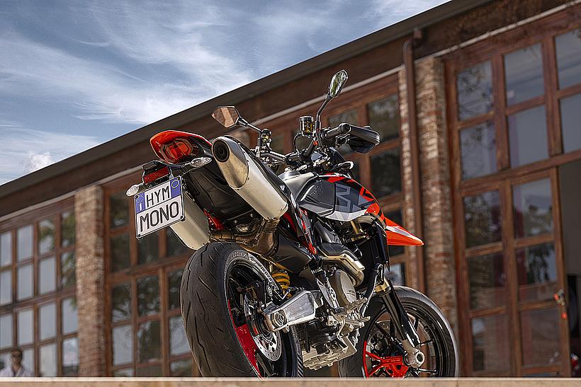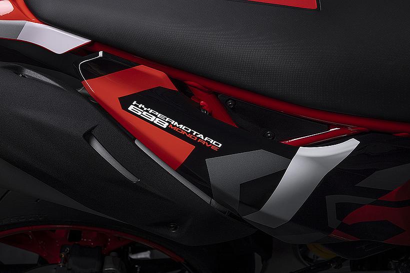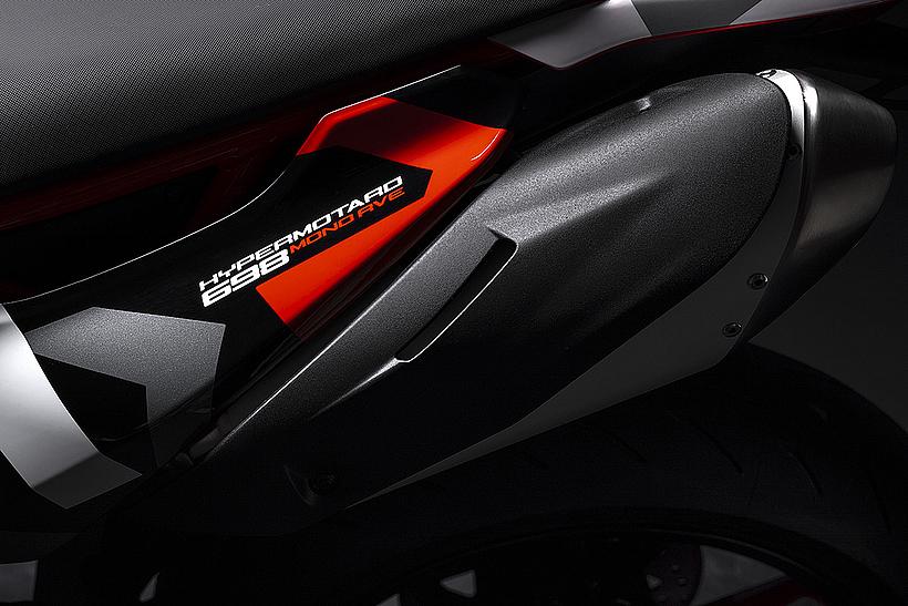 Die Zweiarm-Schwinge der Hypermotard 698 Mono, die eine Länge von 572 mm aufweist, wird aus einem einzigen Stück Aluminiumguss gefertigt. Ihre minimalistische Gestaltung und partiell bearbeitete Oberfläche verleihen ihr eine markante Ästhetik. Trotz ihres geringen Gewichts von nur 3,9 kg bietet sie eine bemerkenswerte Steifigkeit.