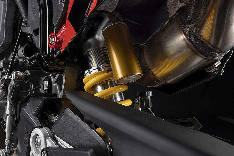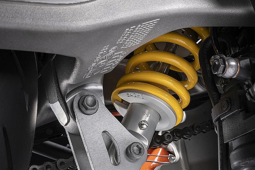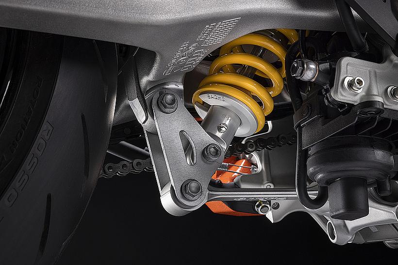 Die Hinterradfederung der Hypermotard 698 Mono wird von einem voll einstellbaren Sachs Federbein übernommen, das in Zug-, Druckstufe und Federvorspannung einstellbar ist und über eine Remote Control verfügt. Dies ermöglicht eine unkomplizierte Anpassung der Feder-Vorspannung per Handrad, ohne dass zusätzlich Werkzeug erforderlich ist.