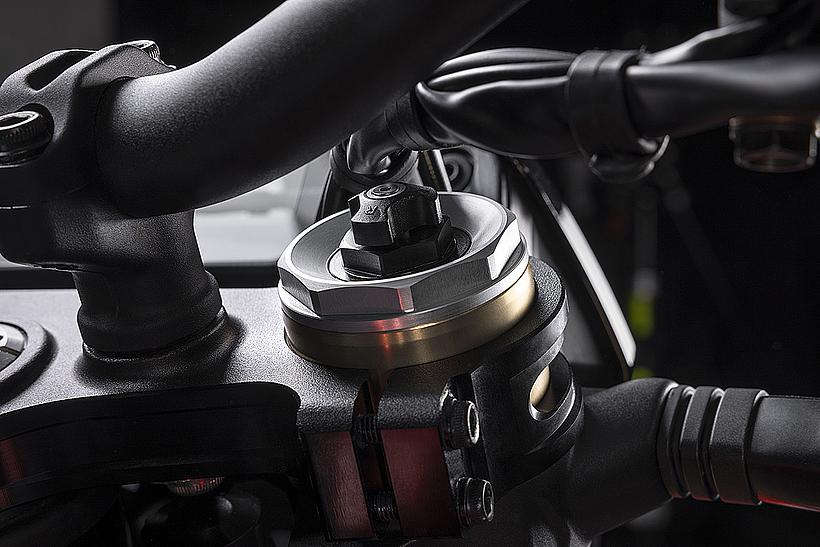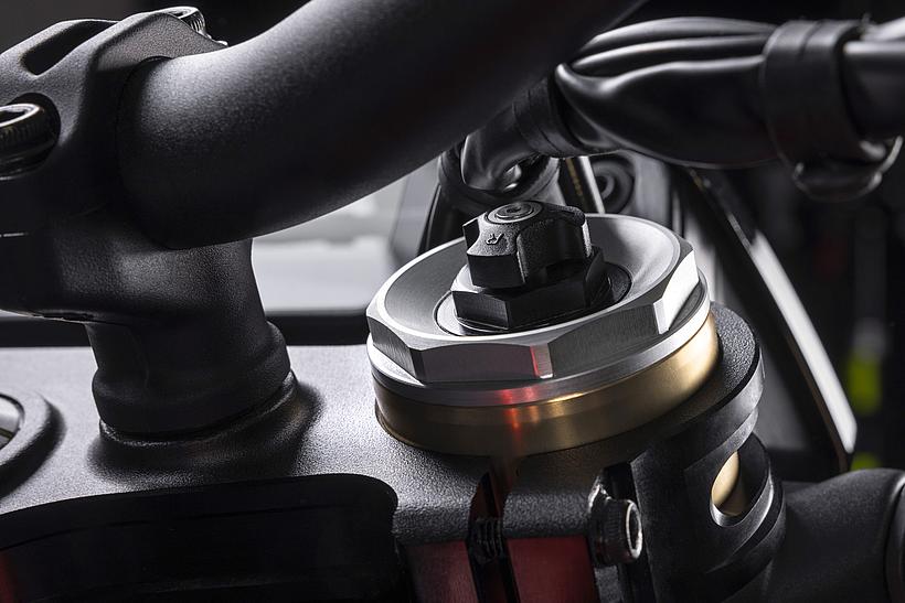 Statt eines Zahnriemens wird ein Zahnrad-Ketten-Antriebssystem für den Antrieb der Nockenwellen verwendet. Dieses hochmoderne Ventiltriebsystem, das auch in der MotoGP zum Einsatz kommt, kombiniert höchste Präzision mit hoher Lebensdauer und reduziert gleichzeitig die Betriebskosten. Die Kipphebel, die sorgfältig hochglanzpoliert sind, verfügen zudem über eine DLC-Beschichtung (Diamond-like Carbon), die die Reibung noch weiter reduziert und die Lebensdauer erhöht. Die beeindruckenden 30.000 km Ventilserviceintervalle sind ein deutlicher Beleg für die Leistungsfähigkeit und Zuverlässigkeit dieses Systems.