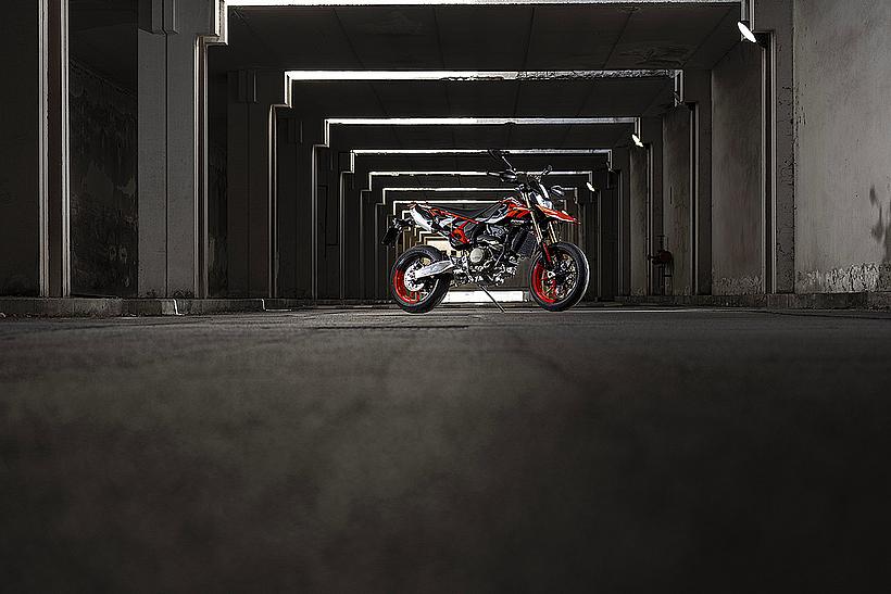 Bei der Hypermotard 698 Mono wurde besonderer Wert auf Kompaktheit und Leichtigkeit gelegt, und das Ergebnis ist beeindruckend: Sie wiegt nur 151 kg im fahrbereiten Zustand. Dies wurde durch die Implementierung zahlreicher hochwertiger technischer Lösungen erreicht, darunter der innovative Gitterrohrrahmen, der sowohl Steifigkeit als auch Leichtigkeit vereint (7,2 kg), die extrem leichte Marzocchi-USD-Gabel mit 45 mm Aluminium-Tauchrohren (8,1 kg), die neuen Felgen (-0,5 kg), die Bremsscheiben mit Aluminiumflansch (-17 %) der serienmäßigen Lithium-Ionen-Batterie…