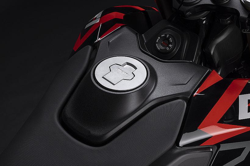 Bei den Instrumenten fällt sofort das kompakte und schlanke Dashboard (133 x 56 mm) auf, das nahtlos in die Scheinwerfabdeckung integriert ist. Das eigens für Ducati entwickelte 3,8-Zoll-LCD-Display mit IBN-Technologie (Improved Black Nematic) und einer kratzfesten Oberflächenbehandlung ist Dank der weißen Zeichen auf schwarzem Hintergrund unter allen Bedingungen perfekt ablesbar. Wie bei der Panigale V4 signalisiert eine grüne LED rechts am äußeren Rahmen den optimalen Zeitpunkt für den Gangwechsel, während die rote LED links das Eingreifen der Assistenzsysteme anzeigt. Trotz seiner Kompaktheit bietet das Display umfassende Informationen, darunter einen Balken-Drehzahlmesser, die Geschwindigkeit, den eingelegten Gang und den gewählten Fahrmodus. Das Layout beinhaltet auch die Symbole des Ducati Multimedia Systems, das als Zubehör von Ducati Performance erhältlich ist und es ermöglicht, das Motorrad mit dem Smartphone zu verbinden und die wichtigsten Multimedia-Funktionen zu steuern, zusätzlich zu denen, die über die Ducati Link App verfügbar sind.