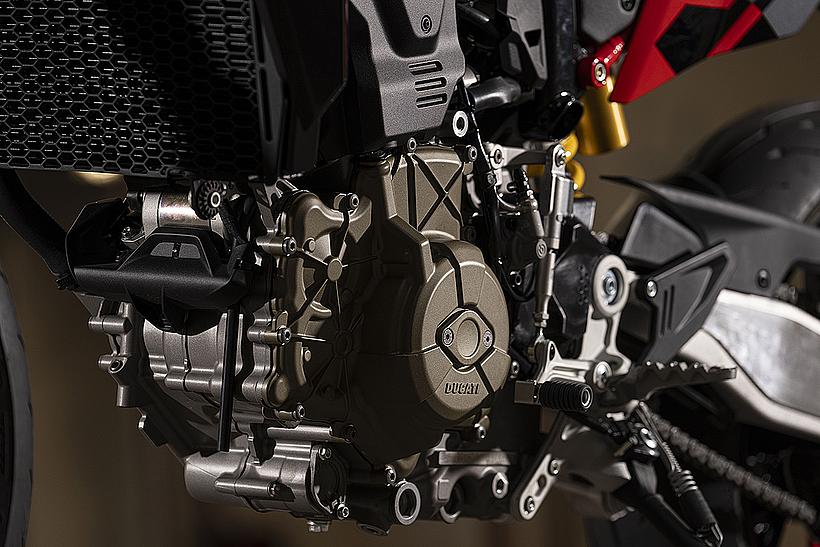 Performance, Leichtigkeit und Kompaktheit charakterisieren den Motor der Hypermotard 698 Mono, der seine Wurzeln im leistungsstärksten Zweizylinder von Ducati, dem 1.285 ccm Superquadro der 1299 Panigale, hat. Dieser beeindruckende Motor bewahrt die 116 mm Bohrung des 1299 Panigale, was einen Rekordwert für einen Einzylinder-Straßenmotor darstellt. Kombiniert mit einem Hub von 62,4 mm ergibt sich ein Hubraum von 659 cm³ für den Superquadro Mono. Dieser äußerst kurzhubige Motor übernimmt neben der Bohrung und dem Hub auch weitere Merkmale wie Kolben, Brennraumform, Desmodromic-System und Titan-Einlassventile von der 1299 Superleggera. Er setzt neue Maßstäbe im Bereich der Hochleistungseinzylindermotoren. Der Name "Superquadro" leitet sich von seinem außergewöhnlichen Bohrung-Hub-Verhältnis von 1,86 ab.