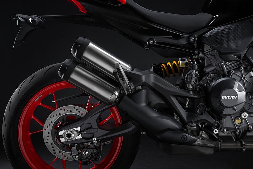 Das 90°-V2-Layout ermöglicht den Bau eines schlanken, charakterstarken Motors mit exzellentem Sound und kraftvoller Leistungsentfaltung – ganz in bester Ducati-Tradition. Der 90°-Zylinderwinkel sorgt zudem für einen natürlichen Massenausgleich der Kräfte erster Ordnung, weshalb keine Ausgleichswelle zur Reduzierung von Vibrationen notwendig ist. Um die Gewichtsverteilung weiter zu optimieren, wurden die Zylinder um 20° nach hinten geneigt, ausgehend vom horizontalen Zylinder. Dieser Motor garantiert exzellentes Handling und sorgt so für maximalen Fahrspaß.
