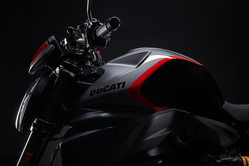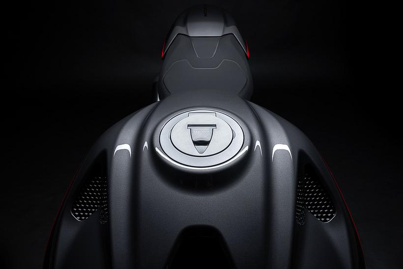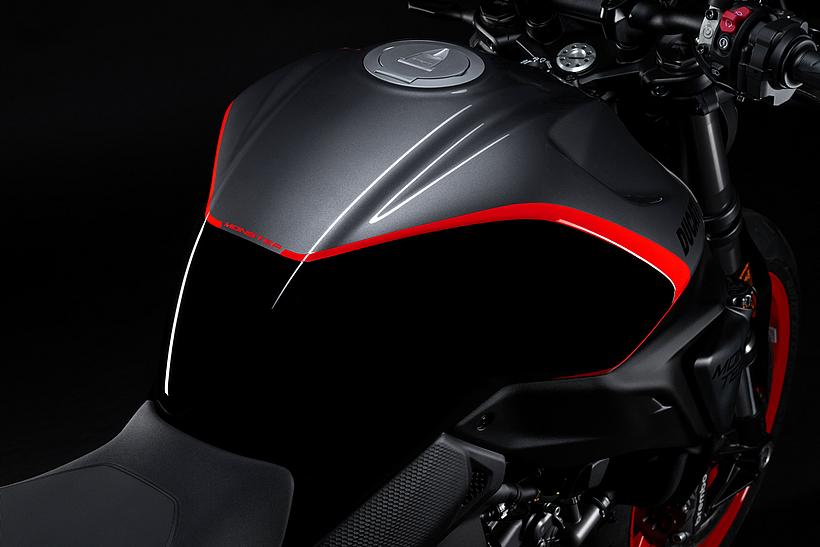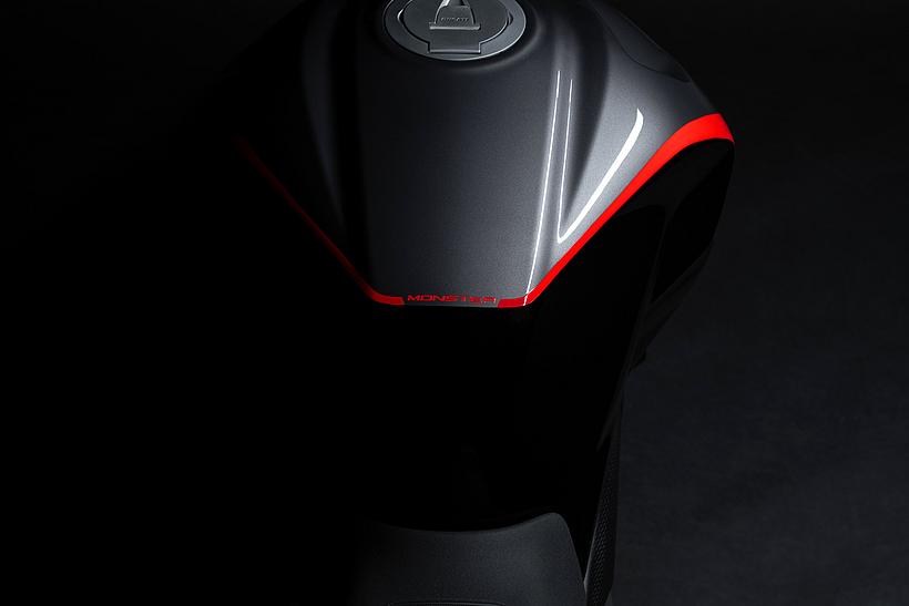 Der Kraftstofftank vereint ein äußerst zeitgemäßes Design mit Inspirationen der legendären Monster-Modelle der Vergangenheit, wie beispielsweise den Lufteinlässen an der Front, die eine doppelte Funktion erfüllen: Sie kühlen das Innere des Tanks und vergrößern den Lenkwinkel, während der muskulöse „Buckeltank“ dem Erscheinungsbild entspricht, das die Monster seit jeher auszeichnet.