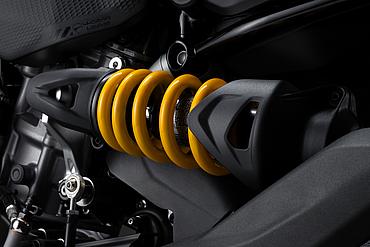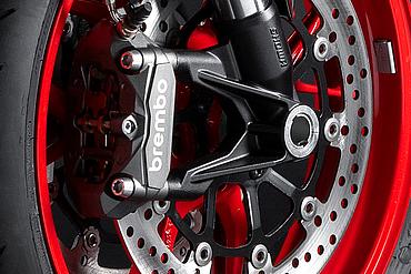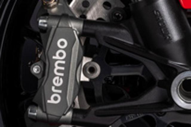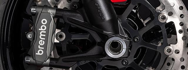 Das Brembo-Bremssystem garantiert eine hohe Bremsleistung bei gleichzeitiger höchster Präzision und Dosierbarkeit am Bremshebel sowie eine große Linearität zwischen der aufgebrachten Bremskraft und der Bremsperformance. Vorne verrichten Brembo M4.32-Monoblock-Bremssättel mit jeweils vier 32-mm-Kolben auf zwei 320-mm-Bremsscheiben ihren Dienst. Die Bremssättel sind in Monoblock-Bauweise, also aus einem Teil gefertigt, was für ein Höchstmaß an Steifigkeit und Formstabilität sorgt und der Bremspräzision sowie Performance zugutekommt. Bremsbeläge aus einer speziell ausgewählten Mischung reduzieren den „Anfangsbiss“ und verbessern so die Dosierbarkeit, besonders im Stadtverkehr. Das vordere Bremssystem wird von einer Brembo PR18/21-Radialpumpe gesteuert, die ein hohes Gefühl mit einer Bremsleistung verbindet, die in diesem Segment Maßstäbe setzt. Hinten verzögert eine 245-mm-Bremsscheibe mit einer Brembo 2-Kolben-Bremszange.