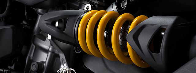 Die 43-mm-Upside-Down-Gabel und das Monofederbein, beide von Showa, wurden speziell kalibriert, um den Komfort im Alltag und die Sportlichkeit auf gemischten Straßen zu optimieren, was den Dual-Charakter der Ducati Monster unterstreicht. Die Monster ist somit stabiler und vermittelt dem Fahrer mehr Sicherheit, bleibt dabei aber wendig und macht Spaß. Das Federbein ist seitlich montiert und direkt an der neuen Zweiarmschwinge befestigt, wodurch sich die Einstellung der Federvorspannung erleichtert.