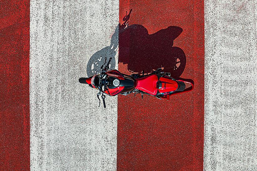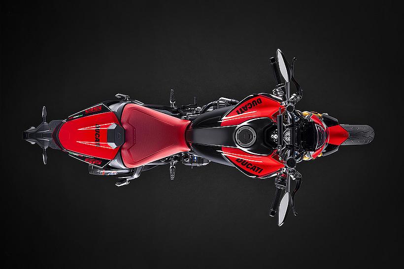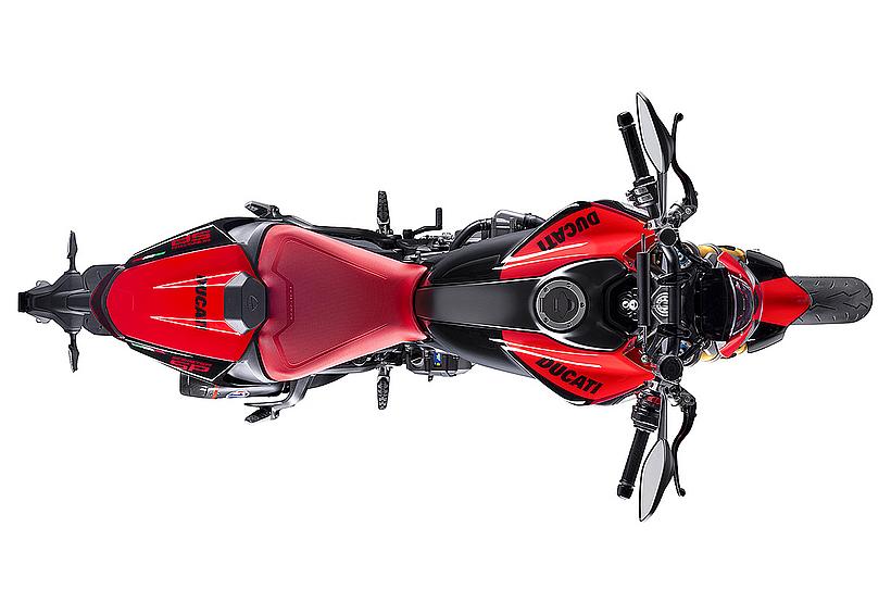 Die SP-Lackierung verleiht der Monster ein attraktiveres und aggressiveres Aussehen, mit Grafiken, die von den Desmosedici-MotoGP-Bikes des Werksteams inspiriert sind. Die Grafik spielt mit den drei Rottönen - Ducati Red, Racing Red, Amaranth Red - im Kontrast zum glänzenden Schwarz und unterstreicht die Dynamik der Monster SP.