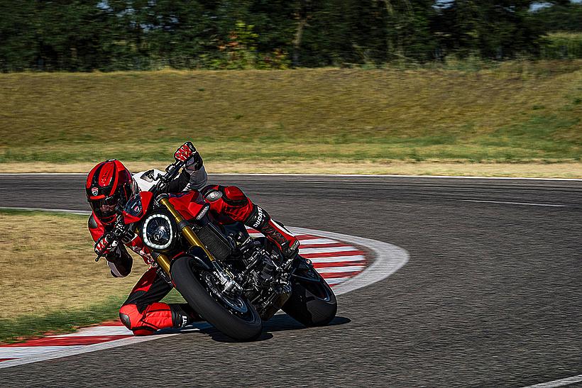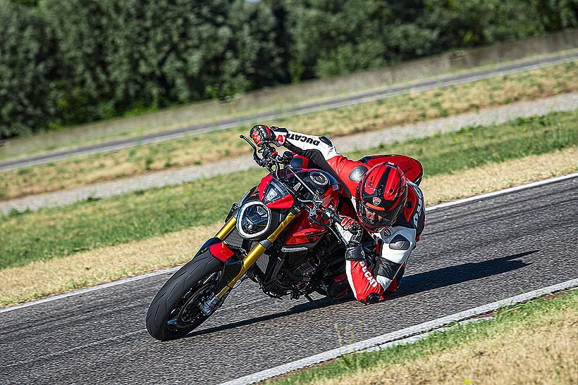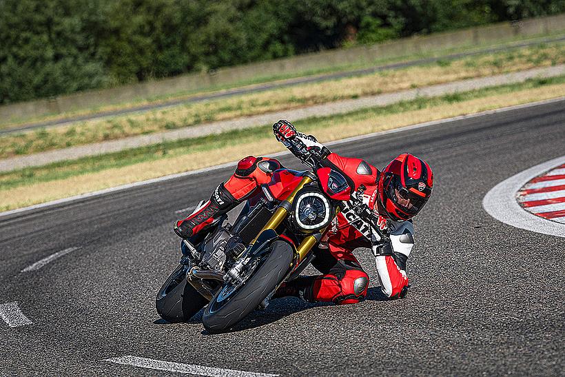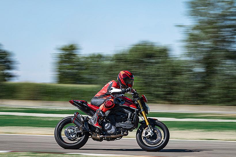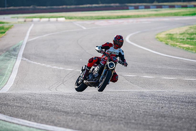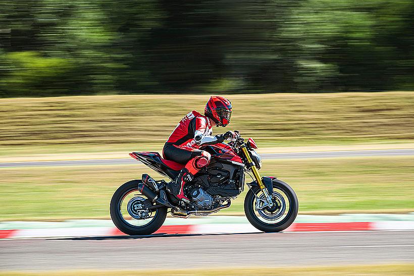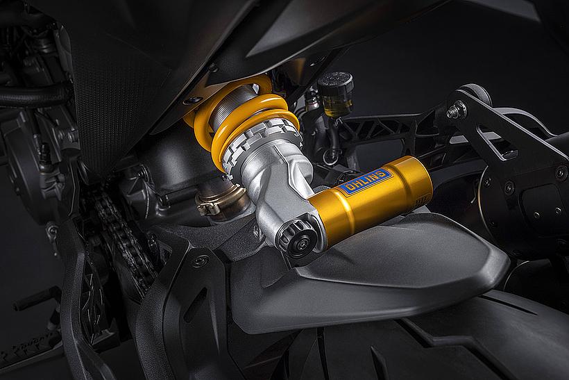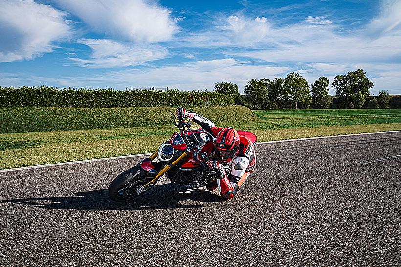 Die voll einstellbaren Federelemente von Öhlins, deren Gabel 0,6 kg leichter ist als die der Monster+ haben vorne und hinten 10 mm mehr Federweg und auch die Abstimmung wurde sportlicher ausgelegt. All das verbessert das Fahrgefühl, erhöht die Bodenfreiheit und ermöglicht auch mehr Schräglage und damit auch jede Menge Fahrspaß auf der Rennstrecke. Die sportliche Ausrichtung wird durch den Lenkungsdämpfer, der die Stabilität beim Beschleunigen und in Kurven verbessert, zusätzlich unterstrichen.