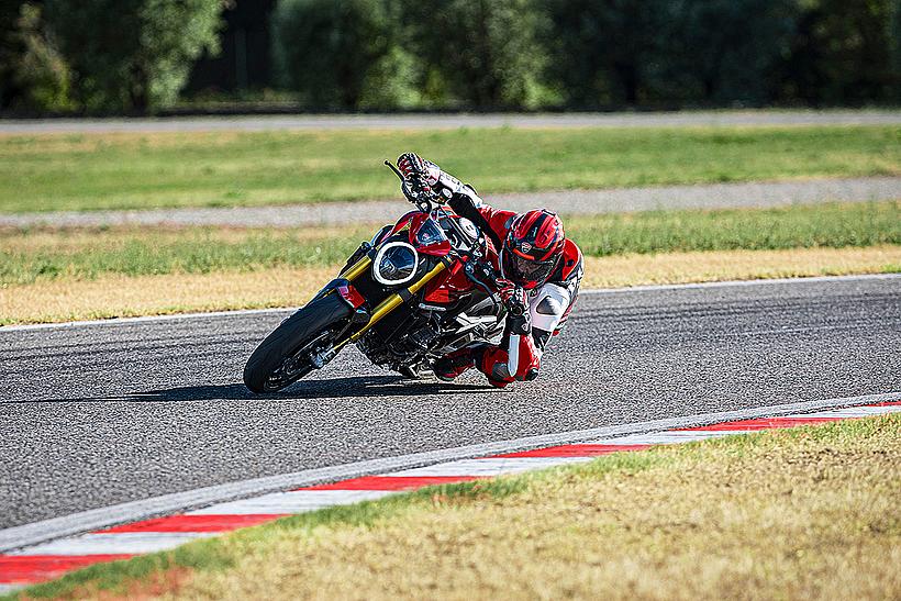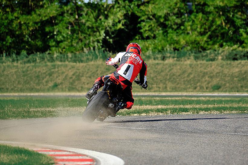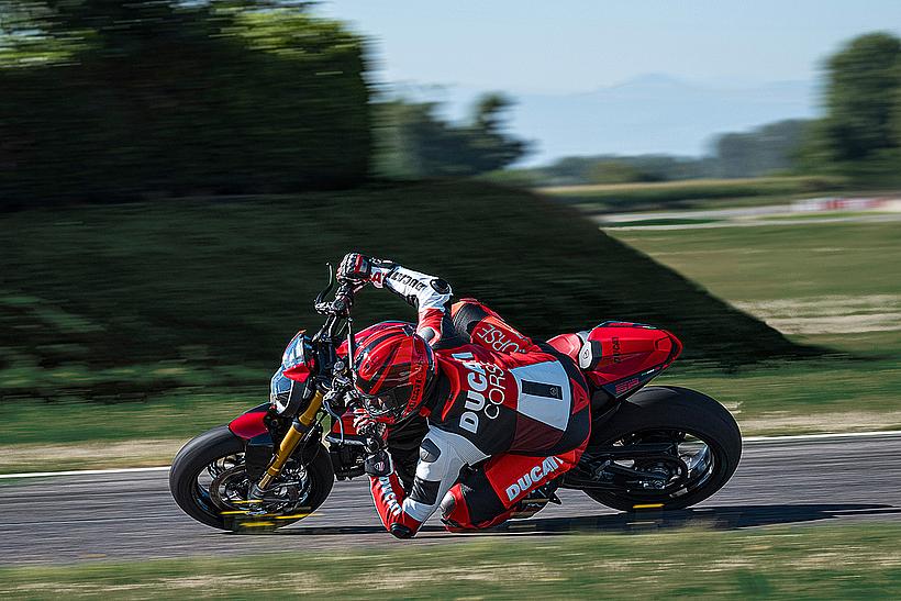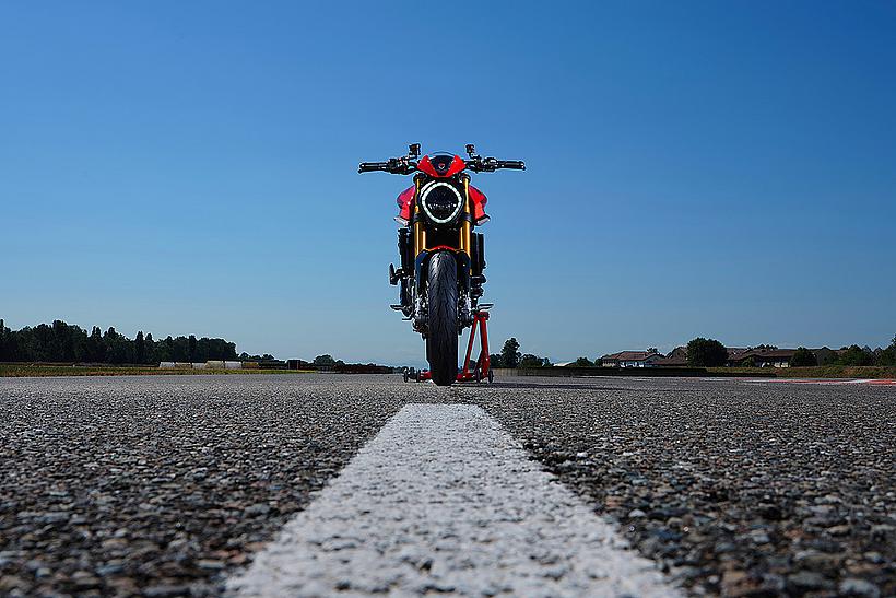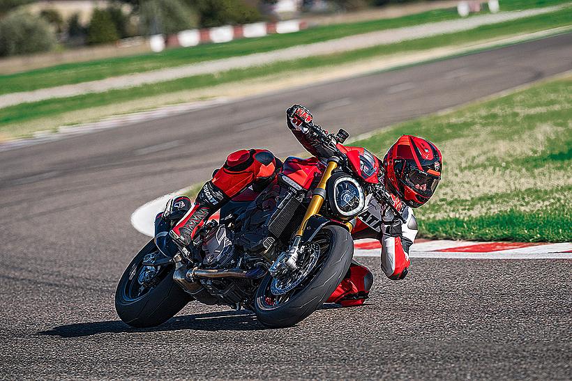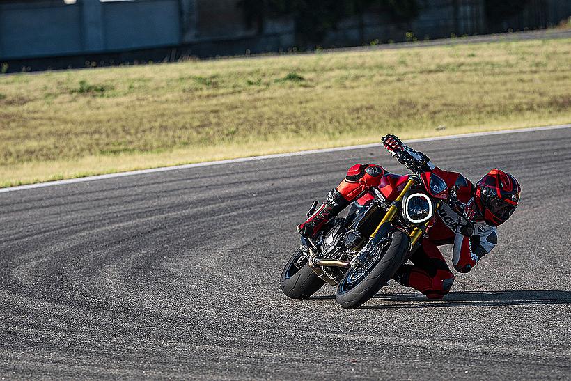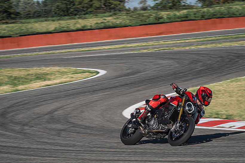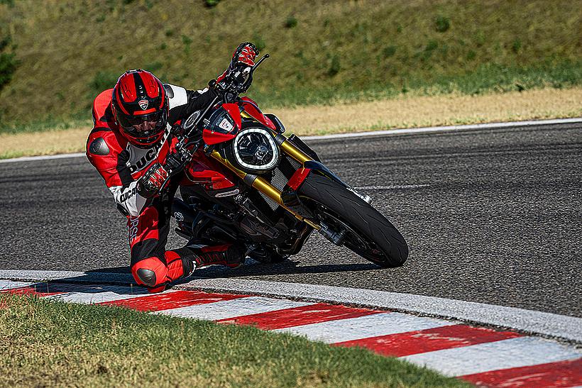 Die voll einstellbaren Federelemente von Öhlins, deren Gabel 0,6 kg leichter ist als die der Monster+ haben vorne und hinten 10 mm mehr Federweg und auch die Abstimmung wurde sportlicher ausgelegt. All das verbessert das Fahrgefühl, erhöht die Bodenfreiheit und ermöglicht auch mehr Schräglage und damit auch jede Menge Fahrspaß auf der Rennstrecke. Die sportliche Ausrichtung wird durch den Lenkungsdämpfer, der die Stabilität beim Beschleunigen und in Kurven verbessert, zusätzlich unterstrichen.