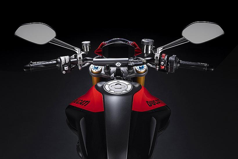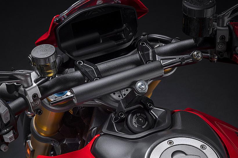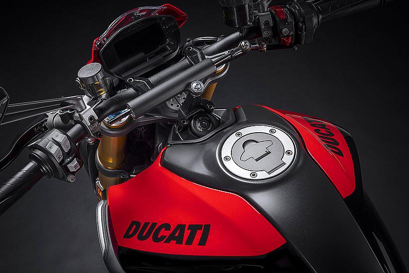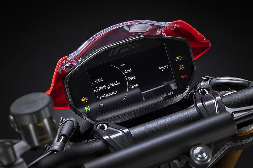 Das Monster-Cockpit wird durch einen 4,3-Zoll-TFT-Farbbildschirm abgerundet. Seine Grafiken stammen von der Panigale V4 und zeigen alle nützlichen Informationen. In der Mitte des Bildschirms werden der Drehzahlmesser und der aktuell gewählte Gang dargestellt. Selbst Lufttemperatur und Kraftstoffstand sind sofort ablesbar. Dieses Gerät ist auch für die Anzeige von Informationen aus dem Ducati Multimedia System (DMS) vorgesehen, welches es ermöglicht, das Smartphone über ein Bluetooth-Modul (als Zubehör erhältlich) mit dem Motorrad zu verbinden und einige Funktionen über die am Lenker angebrachten Tasten zu steuern. Auf dem Display werden die Bedienelemente des "Musik-Players", den Verbindungsstatus des Headsets, eingehende Anrufe sowie die Hinweis-Symbole für empfangene Nachrichten angezeigt.