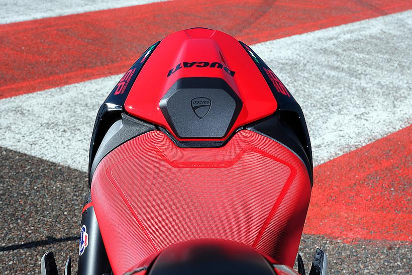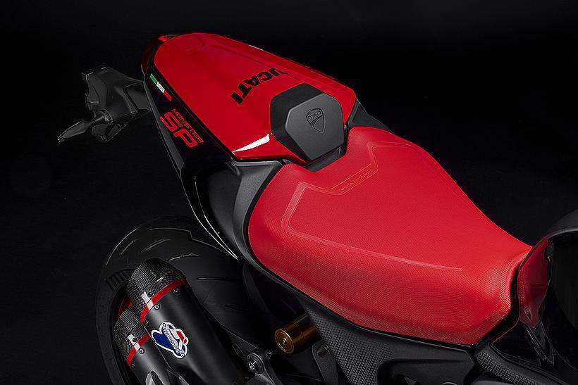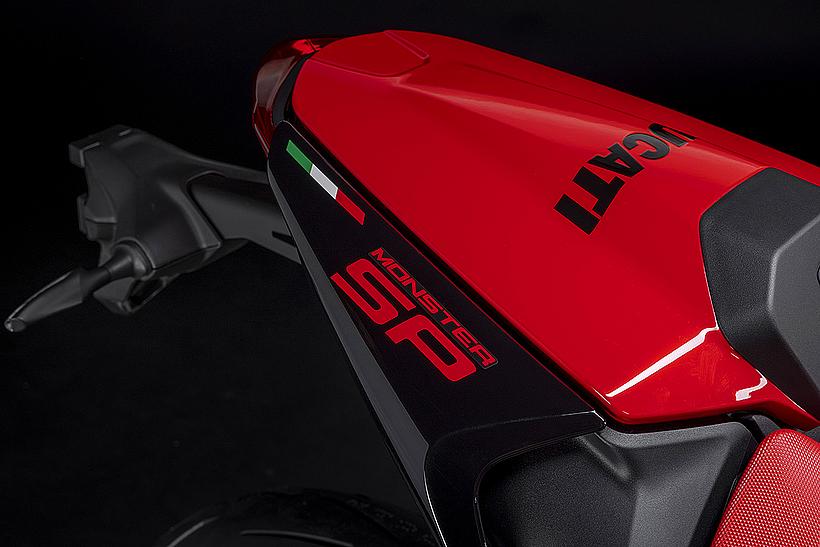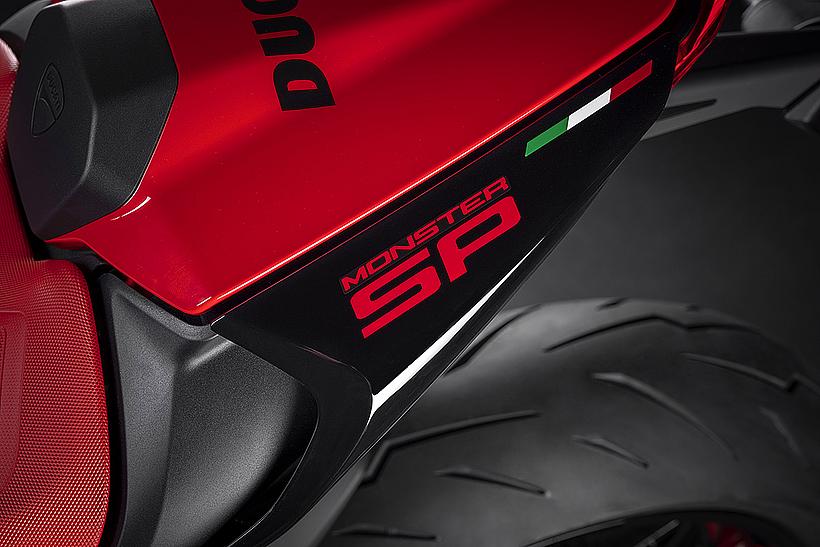 Der Sitz aus rotem Stoff stellt eine enge Verbindung zum Rennsport her und trägt dazu bei, dem Heck Leichtigkeit zu verleihen, indem er die Linie der Seitenteile farblich fortführt. Auf den Seitenteilen ist die italienische Flagge zu sehen, zusammen mit dem spezifischen Logo der Monster SP. Die bei der Monster SP serienmäßige Sitzbankabdeckung und die dezente Bikini-Verkleidung ergänzen das Ausstattungspaket des Monster Top-Modells.