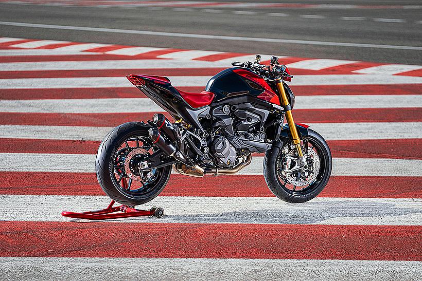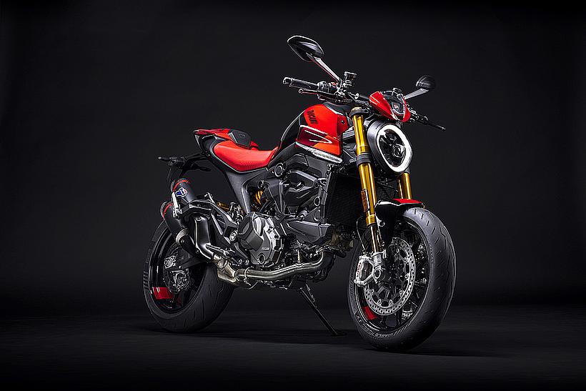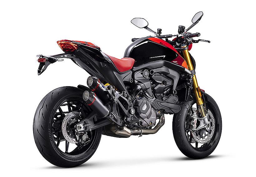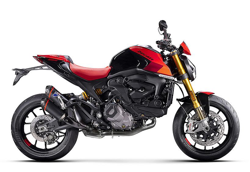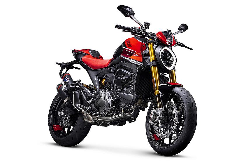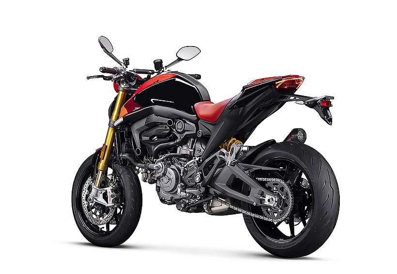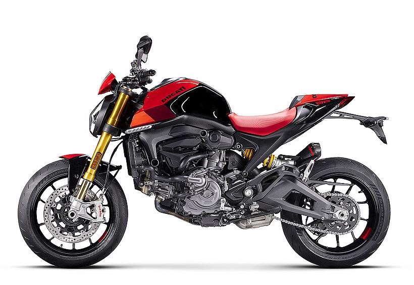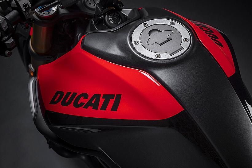 Das Konzept der Monster ist so einfach wie effektiv: ein sportlicher Motor, der sich perfekt für die Straße eignet, kombiniert mit einem Rahmen, der von einem Superbike abgeleitet ist. Der sportliche Charakter der Monster SP wird durch die Lackierung in den 2022er-Farben der Desmosedici GP des Ducati Lenovo Teams, die goldene Eloxierung der Öhlins NIX30-Gabel und den serienmäßigen Schalldämpfer von Termignoni sofort deutlich. Besonders hochwertige Details sind die rote Sitzbank, das Logo auf der Abdeckung des Soziussitzes und am Kraftstofftank, das größer ist und sich an der Grafik der Panigale V4 orientiert.