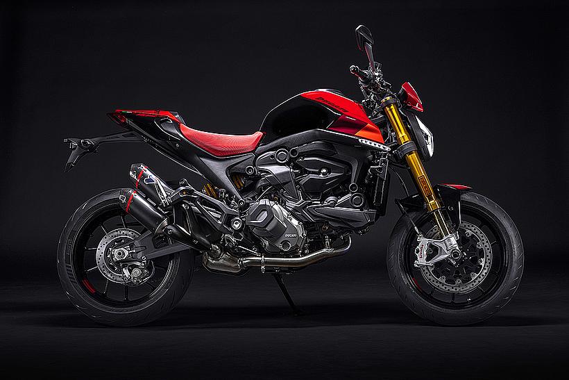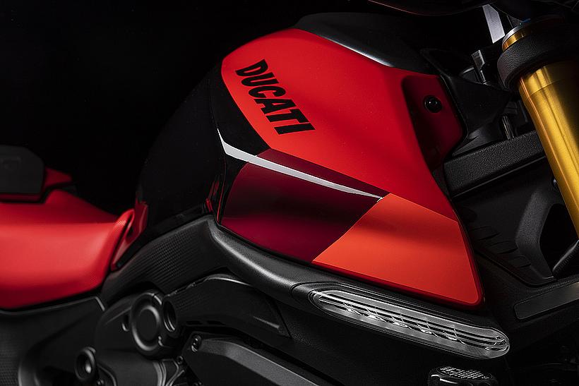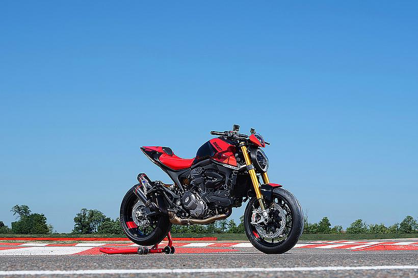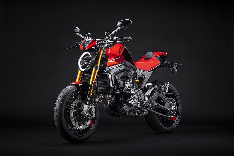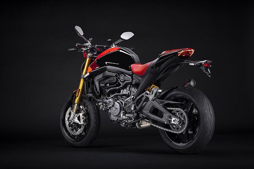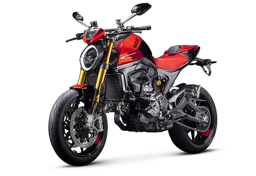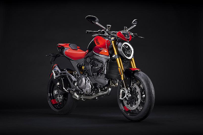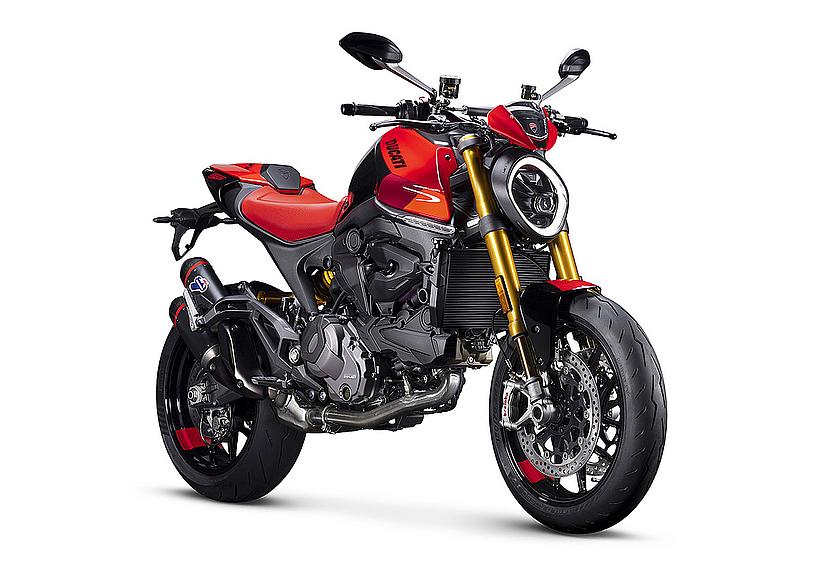 Das Konzept der Monster ist so einfach wie effektiv: ein sportlicher Motor, der sich perfekt für die Straße eignet, kombiniert mit einem Rahmen, der von einem Superbike abgeleitet ist. Der sportliche Charakter der Monster SP wird durch die Lackierung in den 2022er-Farben der Desmosedici GP des Ducati Lenovo Teams, die goldene Eloxierung der Öhlins NIX30-Gabel und den serienmäßigen Schalldämpfer von Termignoni sofort deutlich. Besonders hochwertige Details sind die rote Sitzbank, das Logo auf der Abdeckung des Soziussitzes und am Kraftstofftank, das größer ist und sich an der Grafik der Panigale V4 orientiert.