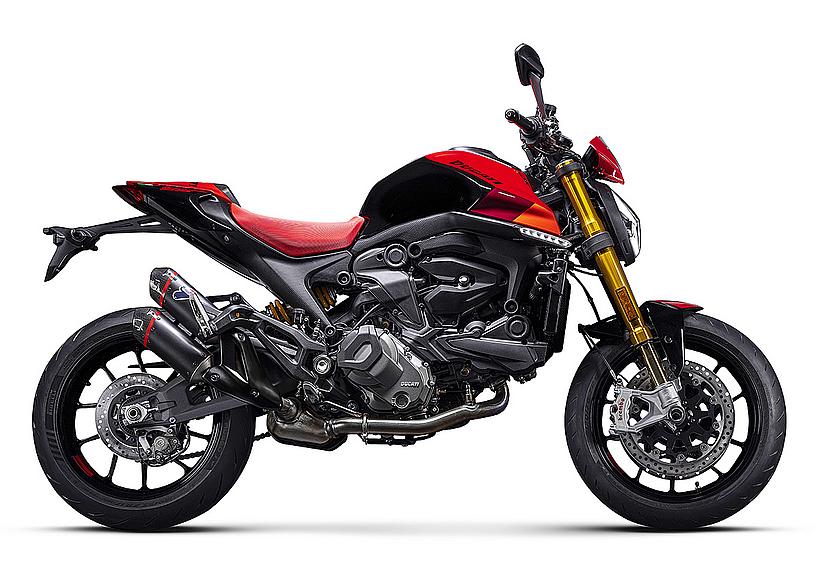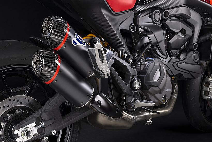 Die Monster SP und 30° Anniversario wird mit einem Termignoni Schalldämpfer, in schwarz gehalten mit rotem Streifen und Carbon-Endkappen geliefert. Sound und Design überzeugen…