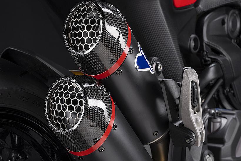 Die Monster SP und 30° Anniversario wird mit einem Termignoni Schalldämpfer, in schwarz gehalten mit rotem Streifen und Carbon-Endkappen geliefert. Sound und Design überzeugen absolut und das ganze selbstverständlich mit Straßenzulassung.
