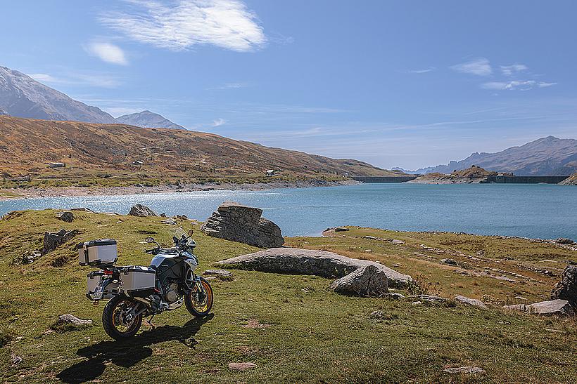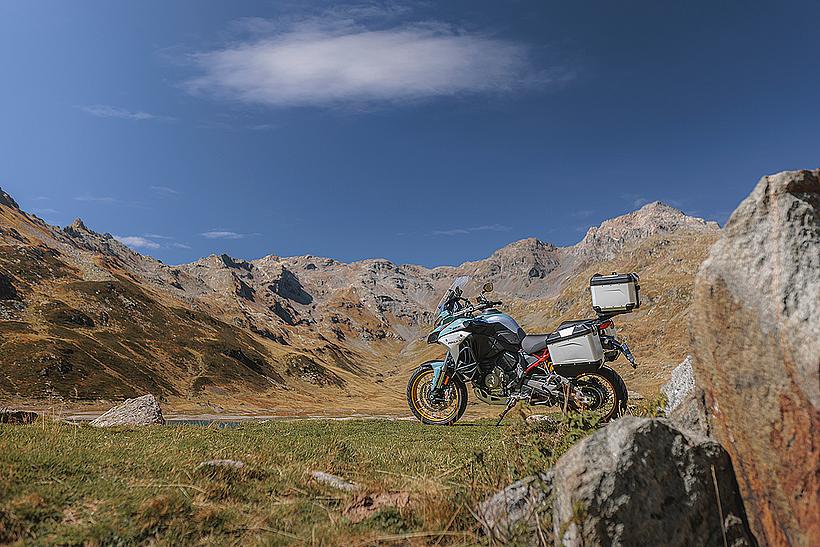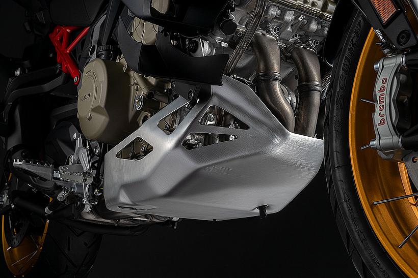 Da die Multistrada V4 Rally auch für den Offroad-Einsatz entwickelt wurde, muss der Motorschutz einiges wegstecken können. Bei der Multistrada V4 Rally FL besteht er aus 3 mm dickem Aluminium und schützt den Motor dadurch noch wirksamer.