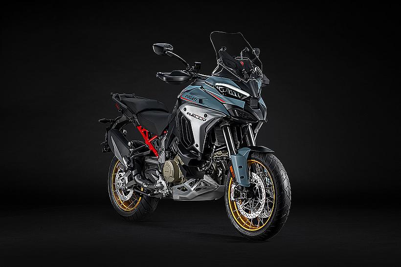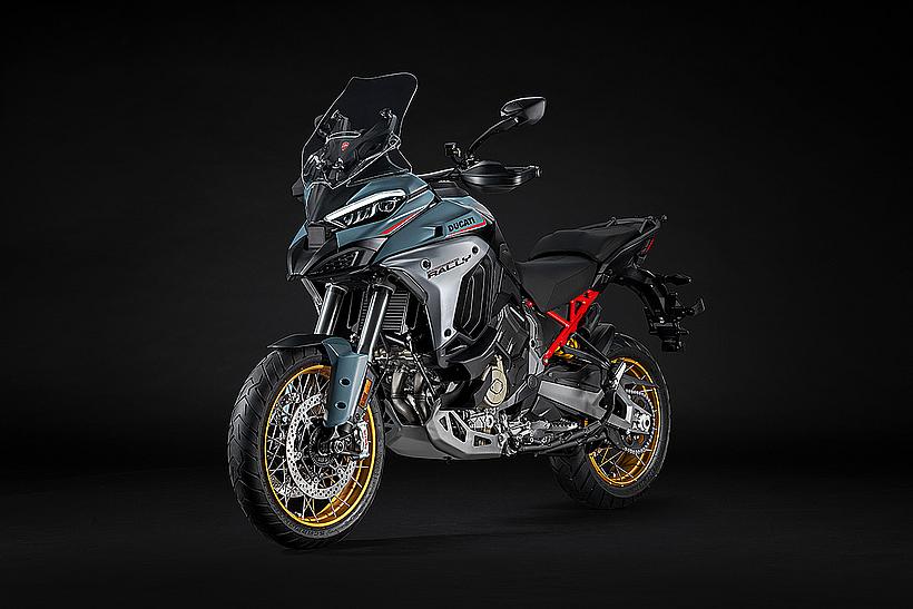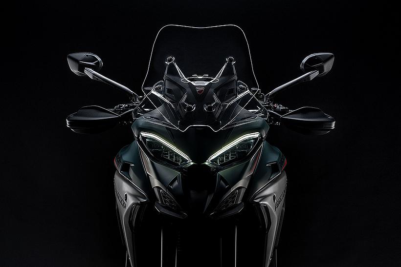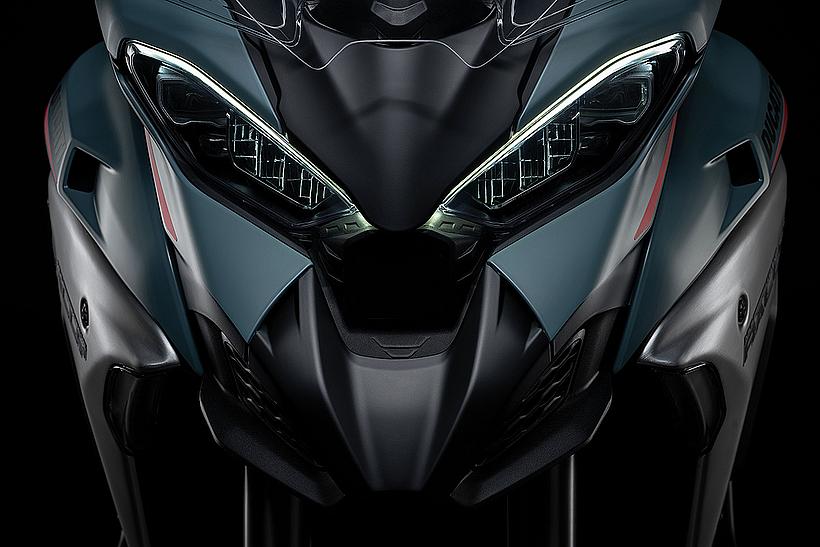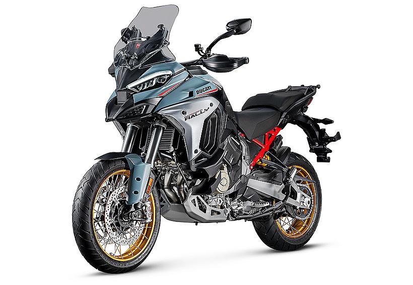Die genetische Basis der Rally-Version ist trotz ihres Globetrotter-Charakters unverkennbar die Multistrada V4. Ihr Design verkörpert die Stilelemente, die die Multistrada-Modelle seit jeher auszeichnen: eine dominante Frontpartie, ein schlankes und leichtes Heck, das die Designmerkmale der Ducati Superbikes in ein Crossover-Motorrad überträgt. Insbesondere die Frontansicht nähert sich dem Stil der neuen Panigale V4 an. Der Doppelscheinwerfer wird durch die neuen lackierten Teile hervorgehoben und gewinnt so an Präsenz – wie seinerzeit bei der 916. Der neue Auspuff hat eine schärfere Linie und einen noch markanteren Sound, was die sportliche Ducati-DNA unterstreicht. Ihr Look ist eine Synthese aus Eleganz und Robustheit, mit einer ausgeprägten Offroad-Attitüde, die vom 19-Zoll-Vorderrad herrührt. Neben dem traditionellen Ducati-Rot wurde für 2026 ein komplett neues Design eingeführt: Jadegrün mit gebürstetem Aluminiumtank und goldfarbenen Akzenten.