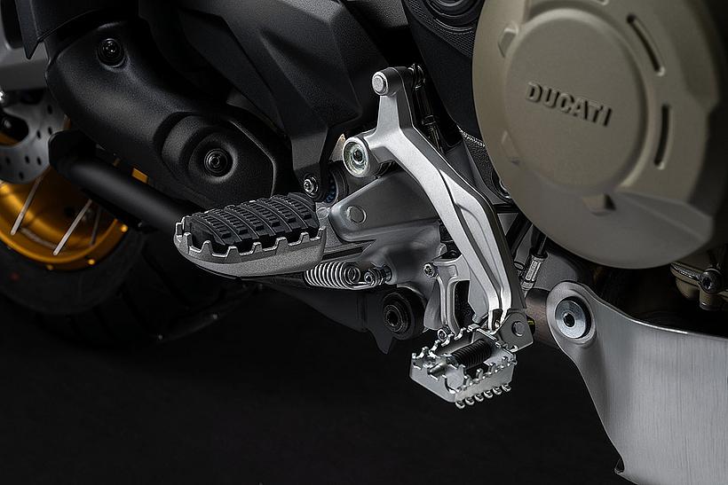 Gerade im Gelände ist der „Grip“ auf den Fußrasten wichtig. Mit einem Handgriff sind die Gummiauflagen von den etwas breiteren, robusten Fußrasten abgenommen und man findet auf den Stahlrasten genug Halt. Der Schalthebel ist mit einem Klappmechanismus versehen, um das Schadensrisiko durch mechanische Einwirkungen zu reduzieren. Der Fußbremshebel ist in der Höhe einstellbar und lässt sich ohne Werkzeug mit einem Handgriff auf stehendes Fahren anpassen. Die Beifahrerfußrasten sind mit größeren Gummieinsätzen ausgestattet, um Vibrationen noch weiter zu reduzieren.