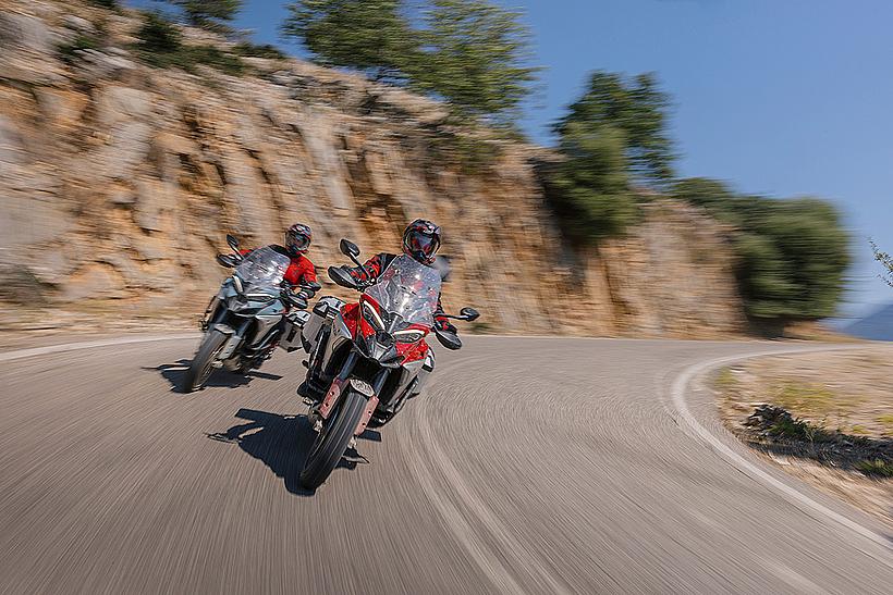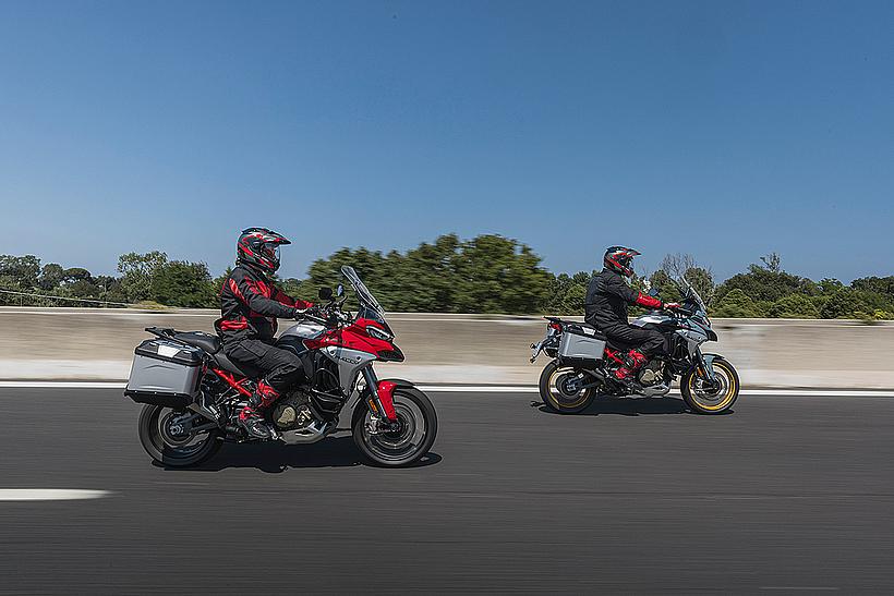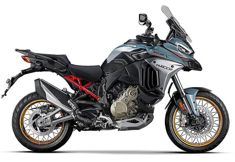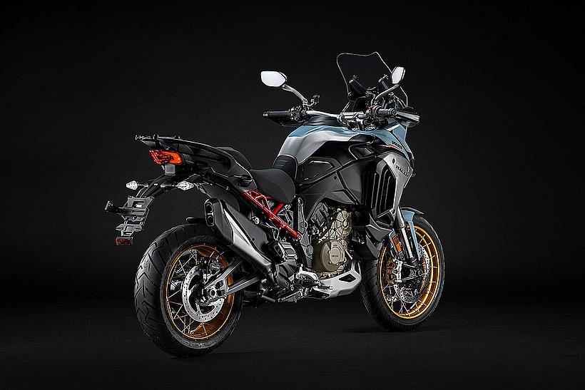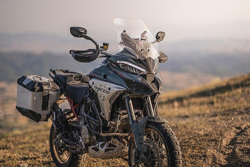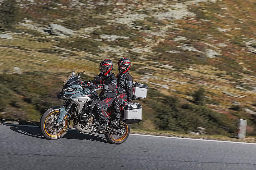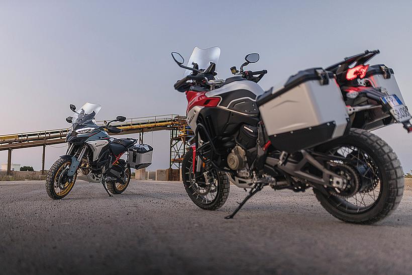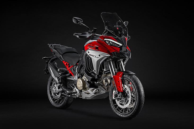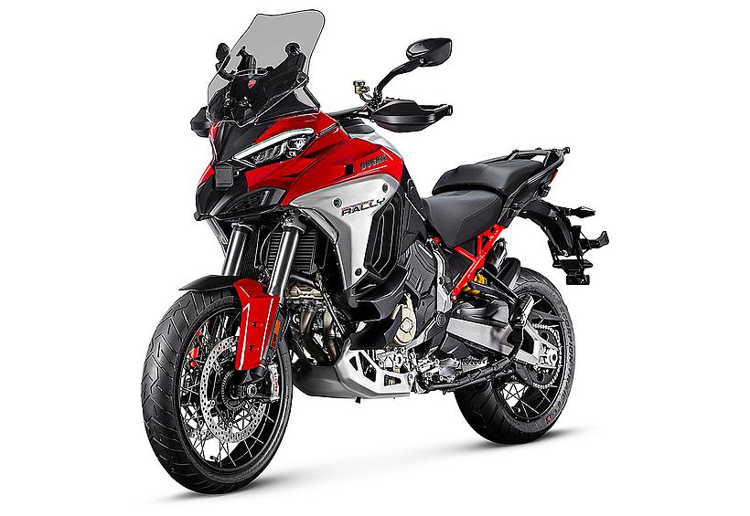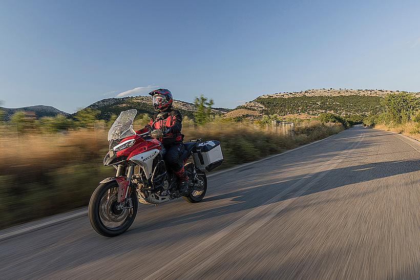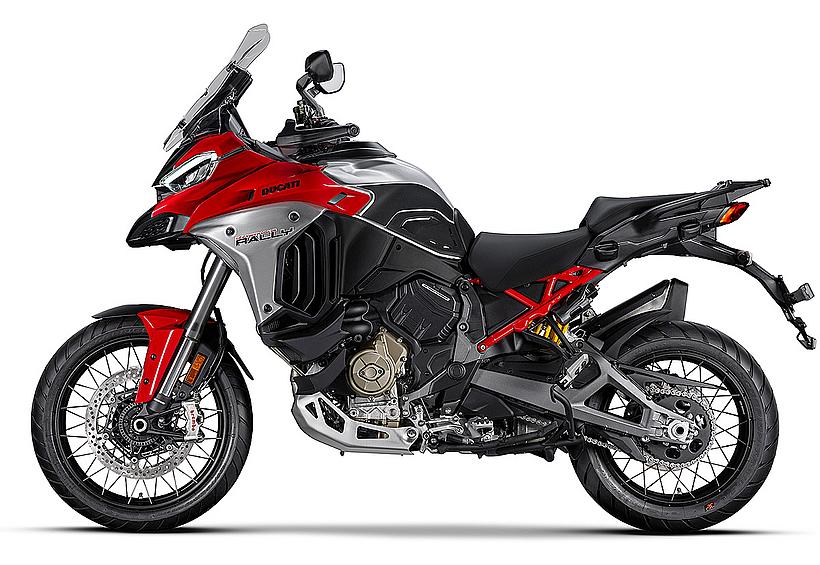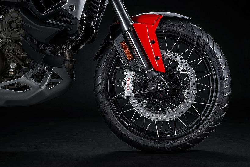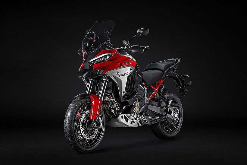 Um die Offroad-Fähigkeiten der Multistrada V4 Rally zu verbessern, verfügt das Fahrwerk über einen Federweg von 200 mm, der im Vergleich zur Multistrada V4 vorne und hinten um 30 mm bzw. 20 mm vergrößert wurde. Die Bodenfreiheit beträgt 230 mm (+10 mm) und erleichtert das Befahren der schwierigsten Passagen. Durch das Plus an Federweg wird zudem der Fahrkomfort in jeder Fahrsituation spürbar erhöht.