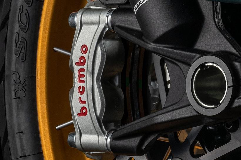 Hydraulische Zweischeibenbremsanlage mit Bosch EVO-Kurven-ABS-System mit rear-to-front Strategie, Funktionsweise einstellbar, 330 mm Bremsscheiben, schwimmend, Brembo 4-Kolben-Monoblock-Bremszangen Stylema M4.30, feststehend, radial montiert, Brembo PR18/19 Bremszylinder