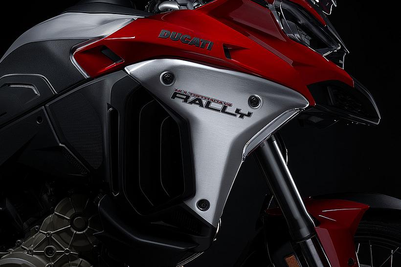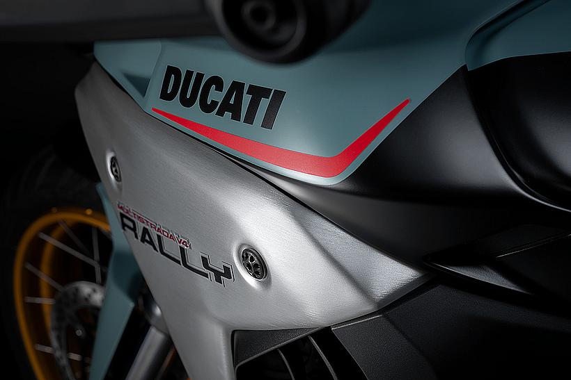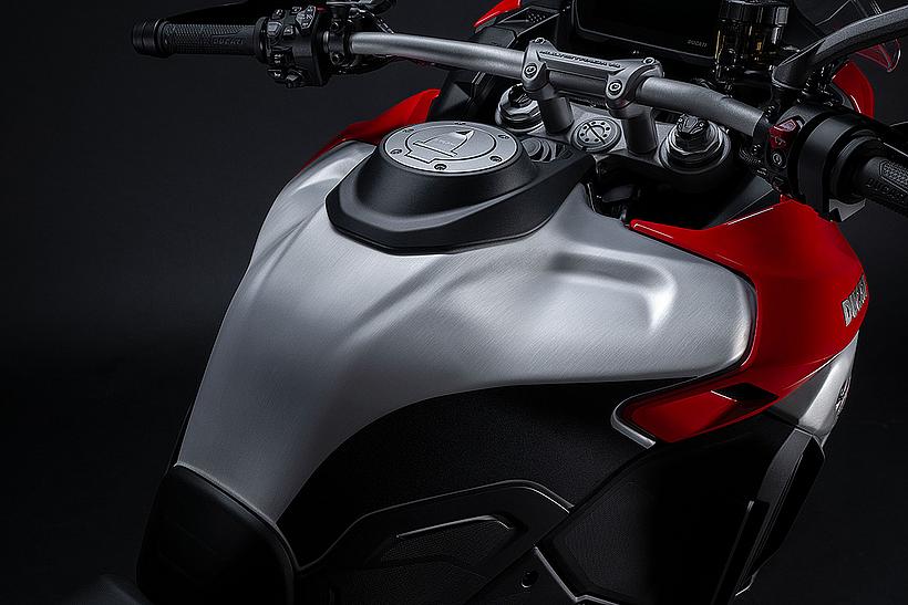 Der Tank selbst hat ein Volumen von 30 Litern – ein wesentliches Merkmal, das besonders für Fernreisen und lange Etappen abseits befestigter Straßen von Bedeutung ist. Trotz des höheren Fassungsvermögens wurde großer Wert darauf gelegt, die Linienführung harmonisch und ausgewogen zu gestalten. Der Tank spielt, von der Seite betrachtet, ebenfalls eine zentrale Rolle im Design der Multistrada V4 Rally und wird durch ein neu gestaltetes „Rally“-Logo auf dem Aluminiumseitendeckel aufgewertet. Die Proportionen des Tanks unterstützen nicht nur die muskulöse und entschlossene Optik, sondern auch die funktionale Ergonomie, indem sie dem Fahrer in stehender wie in sitzender Position maximale Bewegungsfreiheit bieten.