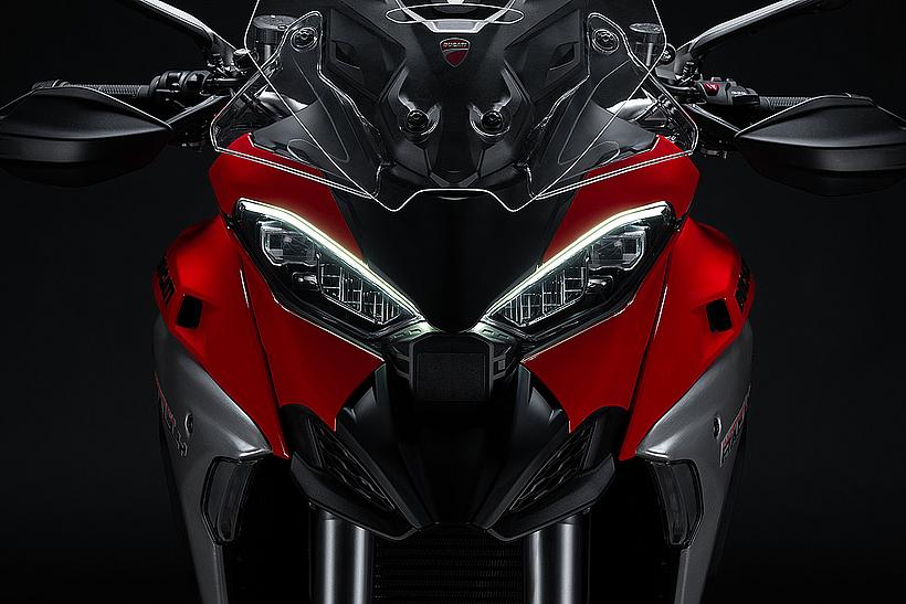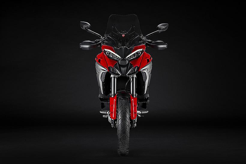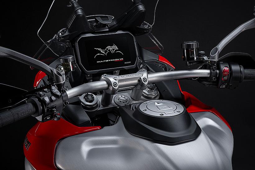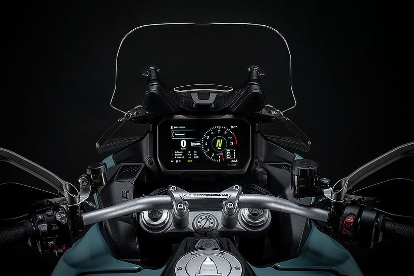 Das 6,5-Zoll-TFT-Farbdisplay ist mit einer Oberfläche aus Mineralglas ausgestattet, dem gleichen Material, das in modernen Smartphones verwendet wird. Dies bietet zwei Vorteile: Es verbessert die Sichtbarkeit, selbst bei direkter Sonneneinstrahlung, und reduziert Reflexionen. Die Informationen sind übersichtlich und gut lesbar, mit einem runden Drehzahlmesser mit digitaler Nadel in der Mitte sowie Anzeigen für den eingelegten Gang, Kraftstoffstand, Außentemperatur und Motortemperatur. Zudem zeigt das Display elektronische Kontrollstufen, Riding Modes und Fahrwerkseinstellungen an. Zusätzliche Informationen, wie die Einstellungen für die Federung, werden ebenfalls angezeigt, und über die GPS-Navigations-App Sygic wird das Kartenmaterial des Navigationssystems bereitgestellt. Dies ist der "Ducati Connect"-App zu verdanken, die eine Verbindung zum Smartphone herstellt und Funktionen wie das Überprüfen des Telefonbuchs, das einfache Beantworten eingehender Anrufe und das Hören von Musik über das Ducati Multimedia System (DMS) ermöglicht.
