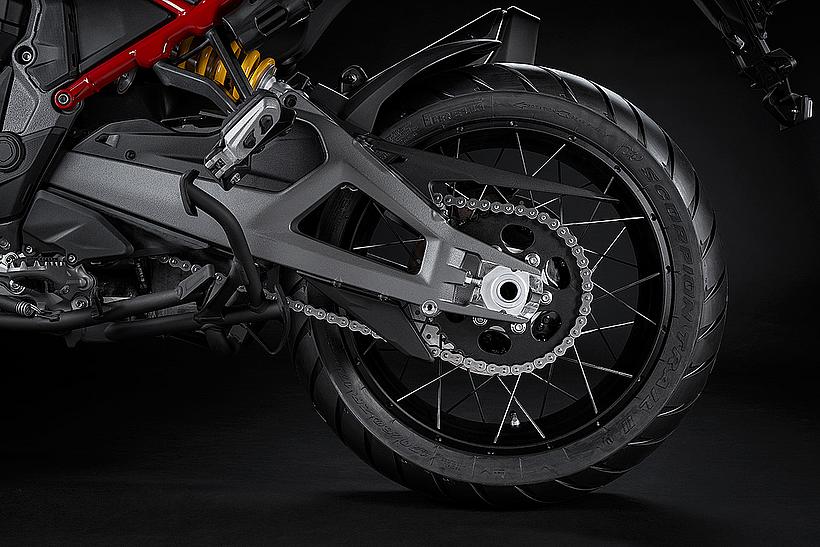 Die neu positionierte Zweiarmschwinge der Multistrada V4 FL Modelle besticht durch ihre leichte und robuste Gitterstruktur. Der Schwingendrehpunkt wurde um 1 mm nach oben versetzt – ein kleiner Wert, der jedoch erhebliche Auswirkungen hat. Diese Anpassung erhöht den Anti-Squat-Effekt, wodurch das Motorrad beim Beschleunigen weniger eintaucht. Dies führt zu einem stabileren Fahrverhalten, besseren Handling und einer verbesserten Fahrdynamik, besonders spürbar bei höherer Zuladung im Soziusbetrieb.
