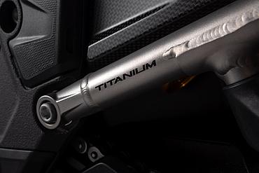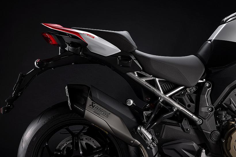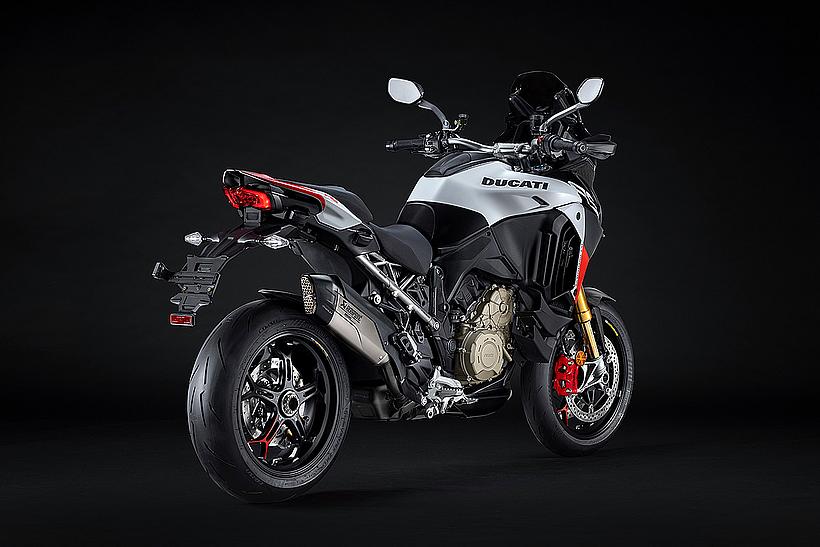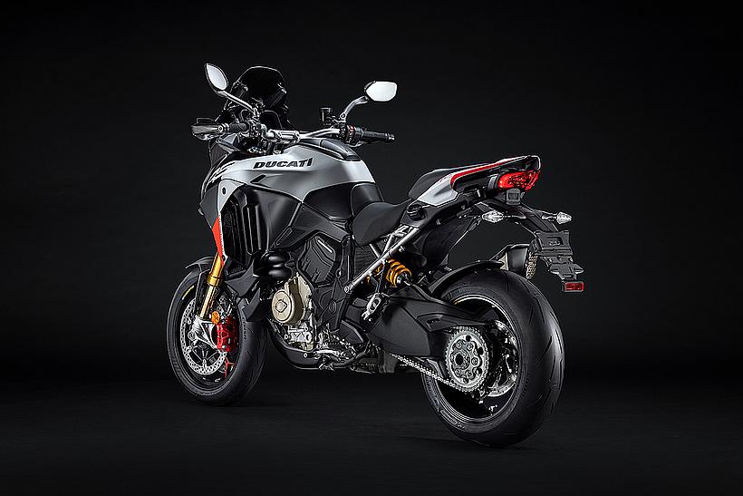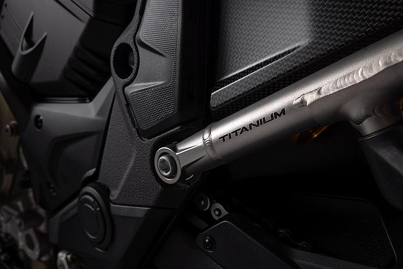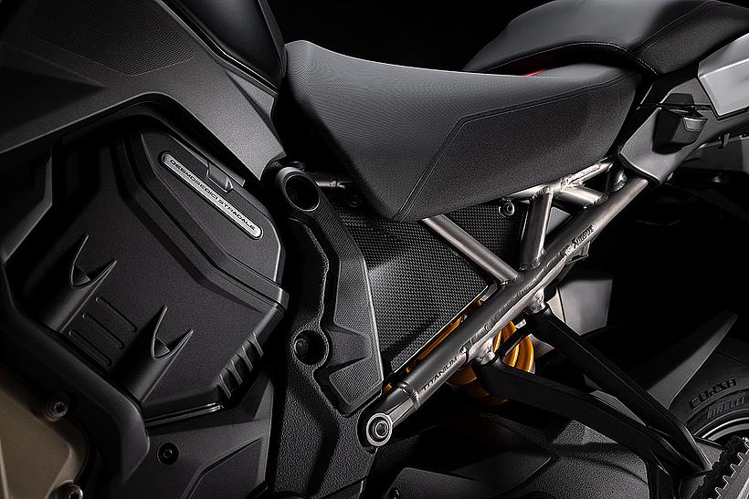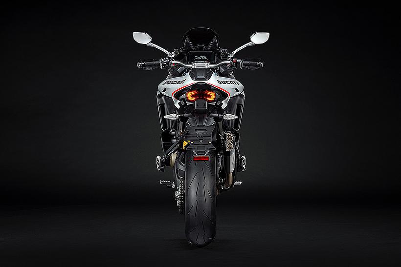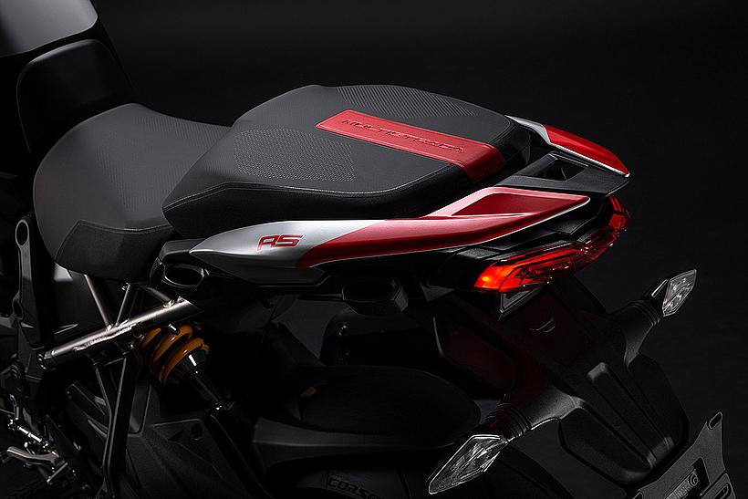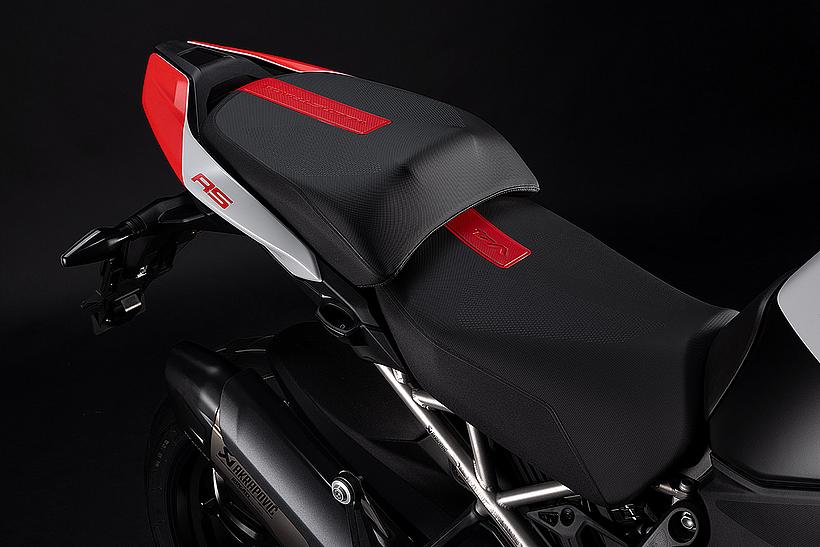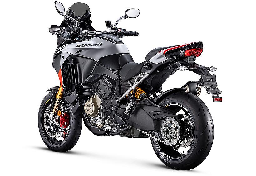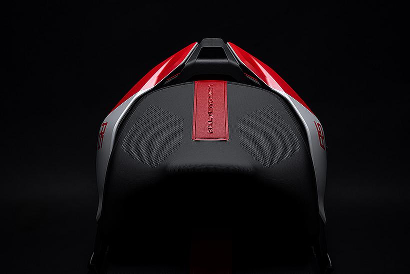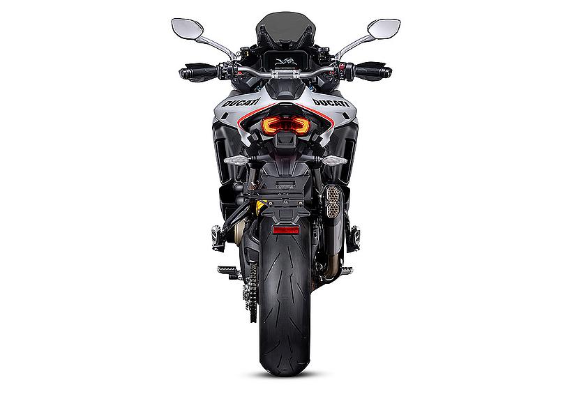 Das schlanke, leichte Heck aus Technopolymer mit integrierten Soziushaltegriffen – das nur in der Multistrada V4 RS zum Einsatz kommt – sorgt für eine sportlich-edle Silhouette. Der Titanium-Heckrahmen reduziert das Gewicht um satte 2,6 kg im Vergleich zur Serienversion, unterstreicht den Racing-Charakter und ermöglicht erstmals die Montage eines Topcases.
