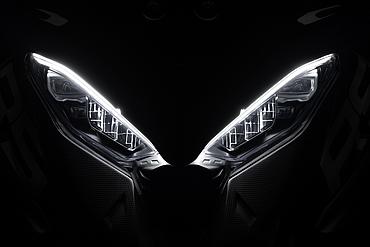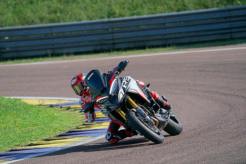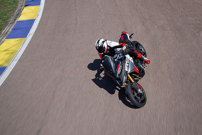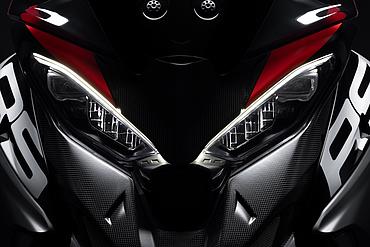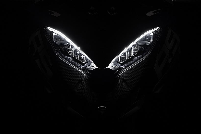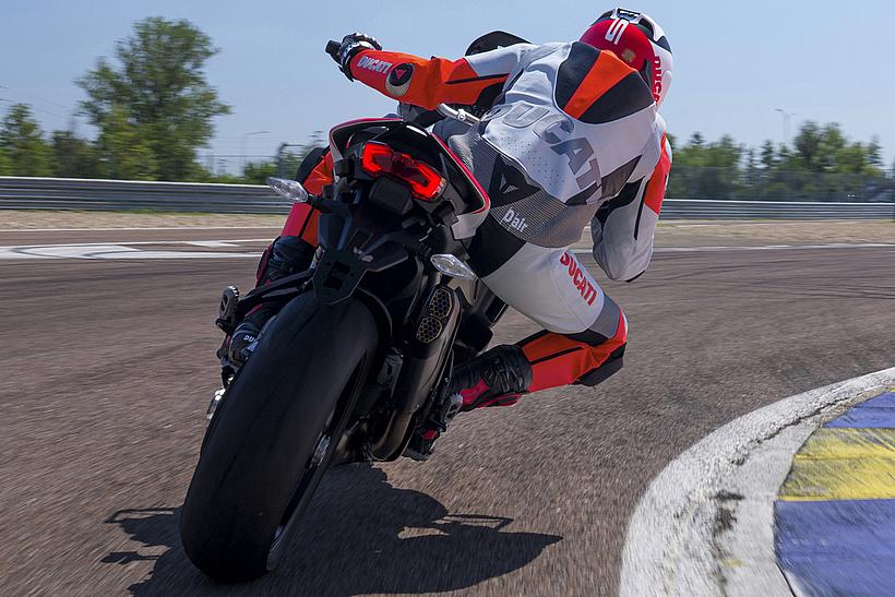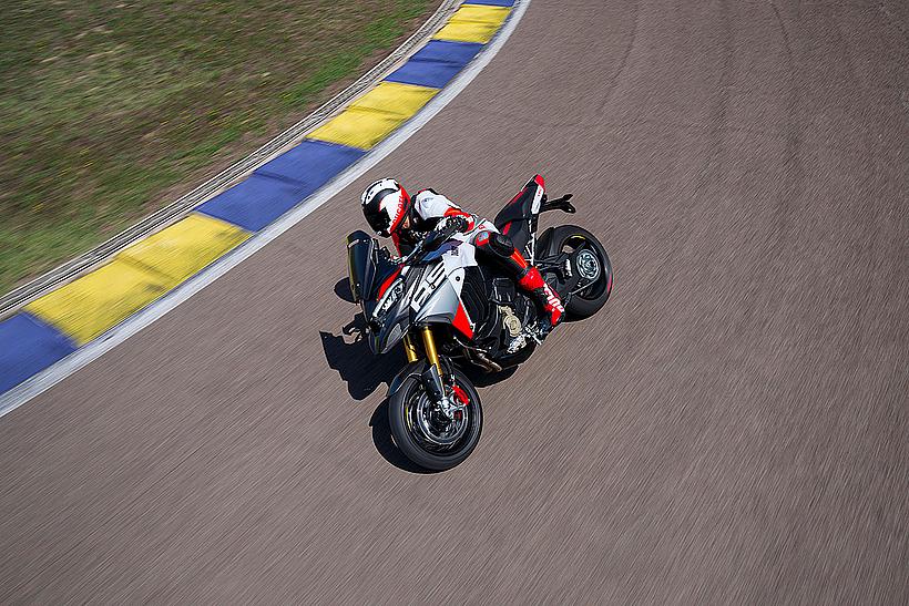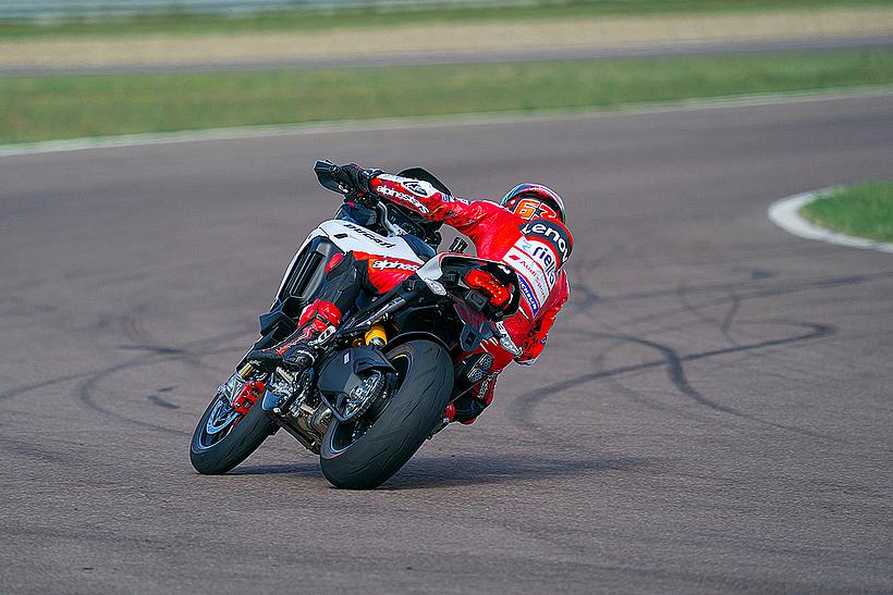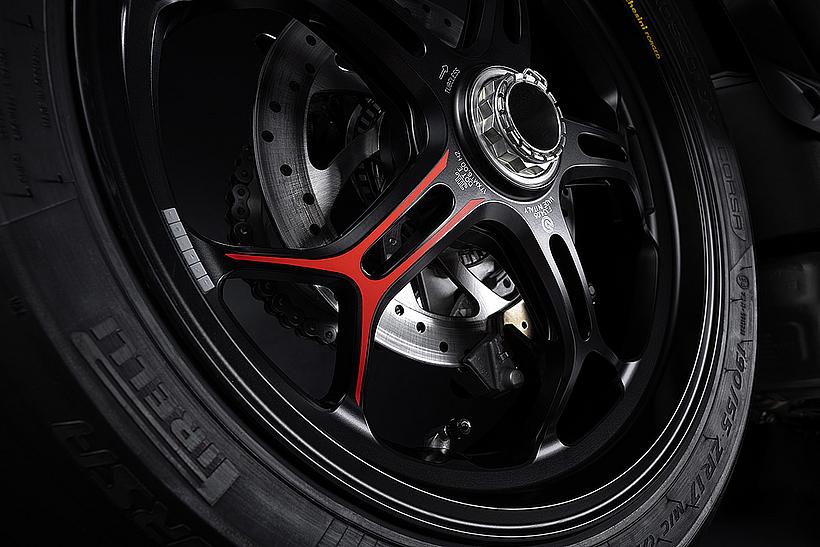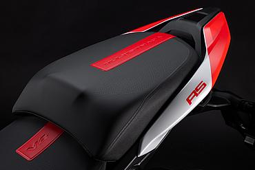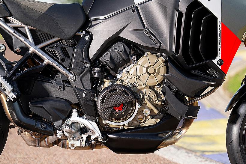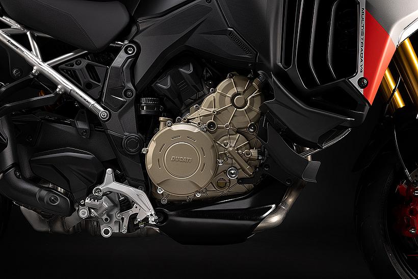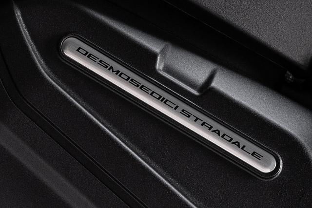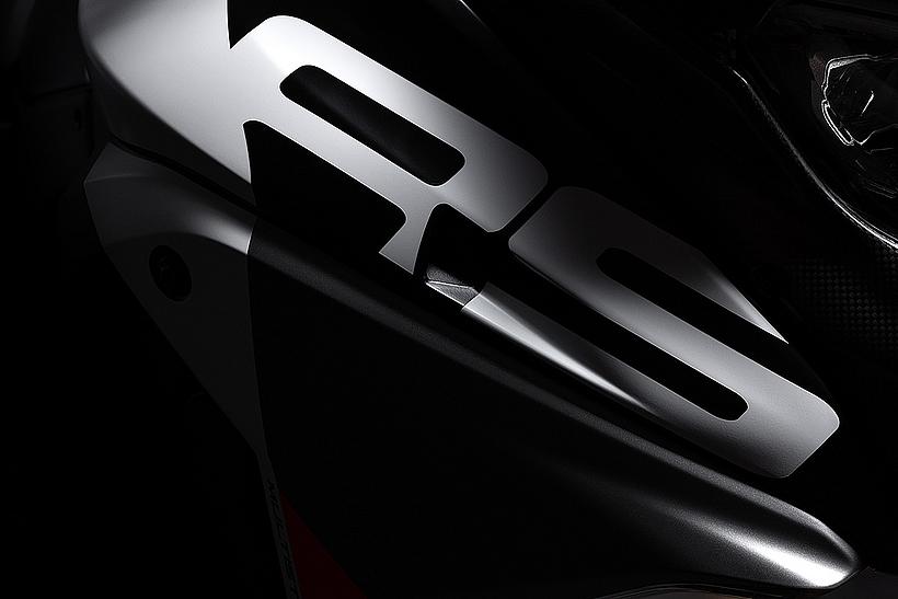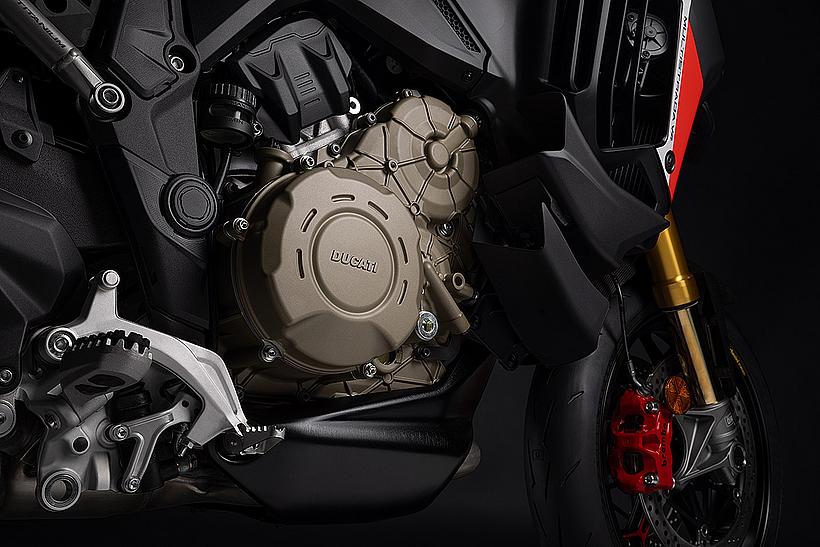 Die enge Zusammenarbeit mit Ducati Corse hat zu einem Motor geführt, der kompakt, leicht und zugleich äußerst leistungsstark ist. In der 90-Grad-V-Bauweise gleichen sich die Massenkräfte erster Ordnung konstruktionsbedingt aus, sodass auf eine Ausgleichswelle zur Reduzierung von Vibrationen verzichtet werden kann. Das spart nicht nur Gewicht, sondern verbessert auch die Drehfreudigkeit und Leistungsentfaltung des Motors. Im Vergleich zu einem klassischen Reihenvierzylinder ermöglicht die kompaktere Bauweise der V-Anordnung eine bessere Massenzentralisierung sowie eine geringere Stirnfläche, was die Aerodynamik verbessert. Zusätzlich reduziert die kürzere Kurbelwelle den gyroskopischen Effekt – ein klarer Vorteil für die Fahrdynamik, insbesondere bei schnellen Richtungswechseln. Das Desmosedici-Stradale-Triebwerk ist um 42 Grad nach hinten geneigt – wie bei den MotoGP-Motoren von Ducati. Diese Neigung verbessert die Gewichtsverteilung, schafft Platz für größere Kühler und erlaubt es, den Schwingendrehpunkt so weit wie möglich nach vorn zu verlagern.