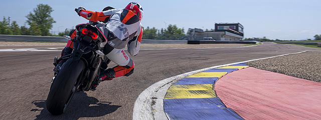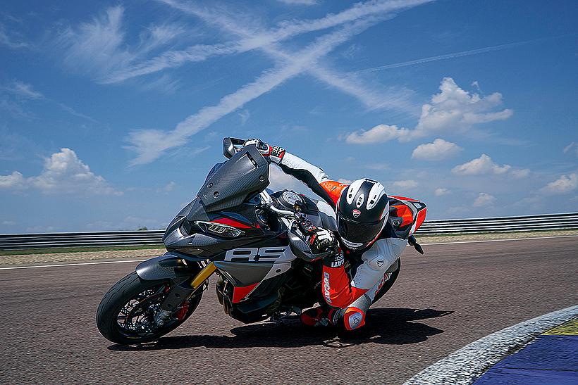 Auch in puncto Ergonomie gibt es bei der Multistrada V4 RS und der Pikes Peak zahlreiche Unterschiede zu den Touring Versionen. Um maximale Kontrolle bei großen Schräglagen zu gewährleisten, wurde die Sitzposition vollständig überarbeitet: Die Fußrasten sitzen 10 mm höher und 10 mm weiter hinten, was die Schräglagenfreiheit deutlich erhöht. Gleichzeitig wurde der Lenker flacher und schmaler gestaltet. Das Ergebnis: Der Fahrer hat beim sportlichen Fahren ein noch besseres Gefühl für das Motorrad – ohne dabei auf Komfort verzichten zu müssen. Auch die Geometrie wurde im Vergleich zur Multistrada V4 überarbeitet: Der Lenkkopfwinkel beträgt nun 25,75° (+1,55°), der Nachlauf liegt bei 120 mm (+19,4 mm), und der Radstand wurde auf 1.595 mm verlängert (+29 mm).
